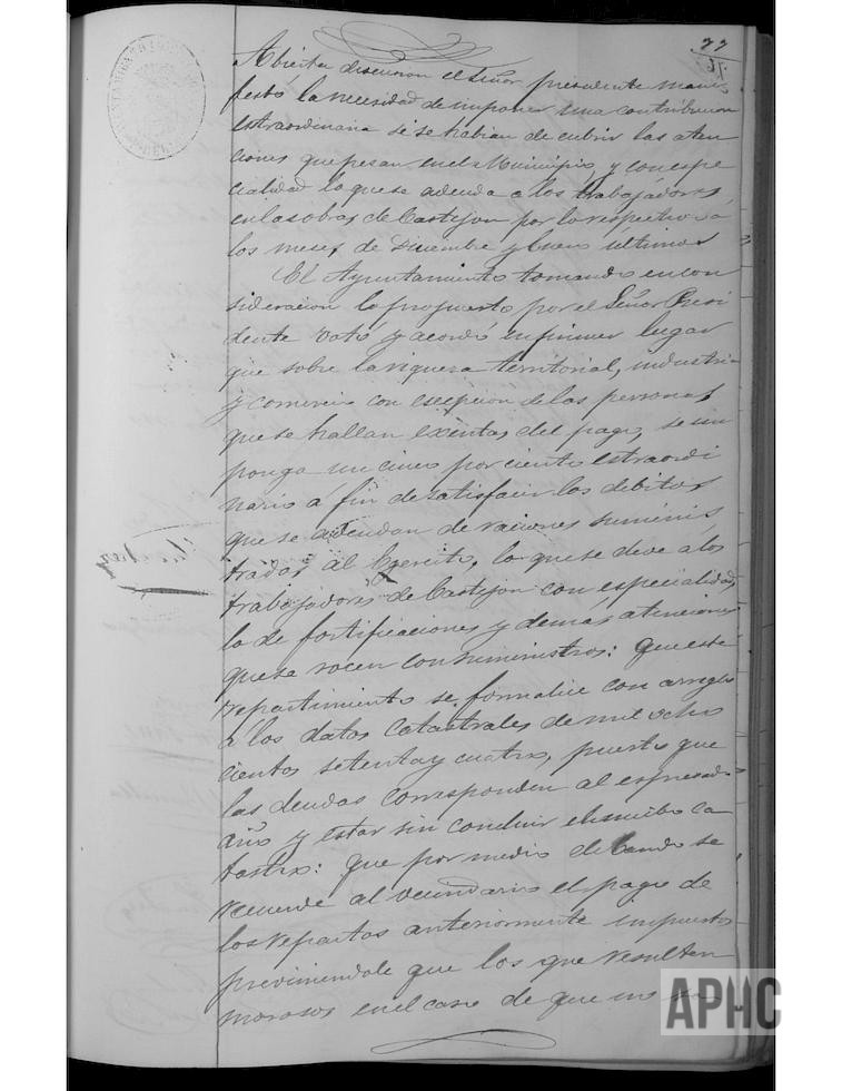 Para atender las obligaciones de pago pendientes, entre las cuales se encuentran las correspondientes a los meses de diciembre y enero de los trabajadores que se desplazan a Castejón y otras relativas a suministros al Ejército, se acuerda la imposición de una contribución extraordinaria del 5% sobre la riqueza territorial, industria y comercio, advirtiendo a los morosos que el Comandante Militar podrá ocuparlos en trabajos de fortificaciones. Se acuerda, también, nombrar recaudador de dicha contribución extraordinaria a Raimundo Virto. Se acuerda que los primeros fondos que se ingresen, se destinen al pago de las dotaciones de los maestros.