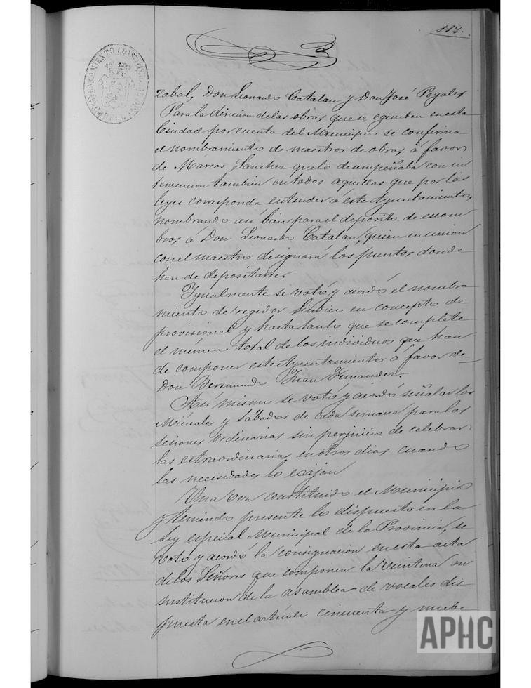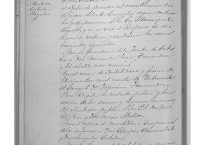 El Alcalde-Presidente es Ruperto Azanza. Se procede a los nombramientos entre los Concejales, según costumbre y de conformidad con la vigente Ley Municipal, con el siguiente resultado: Presidente de la Junta de Catastro Beremundo Juan Fernández y en su ausencia el Sr. Alcalde. Para el ramo de Contabilidad y firma de libramientos con el carácter de Interventor al concejal Francisco Fernández. Para vigilancia de conducta, policía y buen servicio de serenos y régimen económico de alumbrado público a Juan José Gil Pérez y Enrique Alcobilla. Para el repeso de comestibles e inspección de los mismos a Claudio Ormazábal y Leonardo Catalán. Para la dirección de arbolado, plantaciones de viveros y caminos a José Poyales. Para el servicio de bagajes y control del turno conveniente a Claudio Ormazábal, Leonardo Catalán y José Poyales. Para la dirección de Obras, se confirma al Maestro de Obras Marcos Sánchez, interviniendo también en los lugares para depósito de escombros el concejal Leonardo Catalán. Regidor Síndico a Beremundo Juan Fernández. Se acuerda y señalan los miércoles y sábados para las sesiones ordinarias, sin perjuicio de celebrar las extraordinarias en otros días cuando sean necesarias. Se nombran los miembros de la Veintena, en sustitución de la Asamblea de vocales, resultando nombrados: Serapio Manuel Francés, Miguel Gómez, Canuto Gómez, Ramón Jiménez, Juan Lasantas, Florencio Esparza, Martín Sanz, Miguel Bonilla, Joaquín José Octavio de Toledo y Eusebio Sánchez.