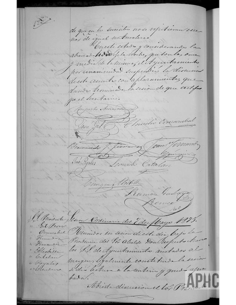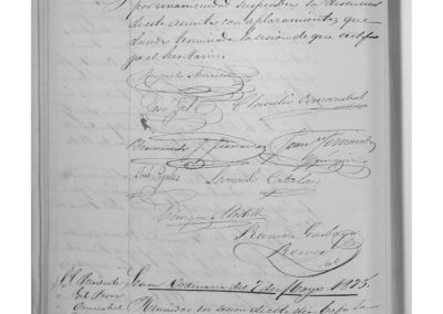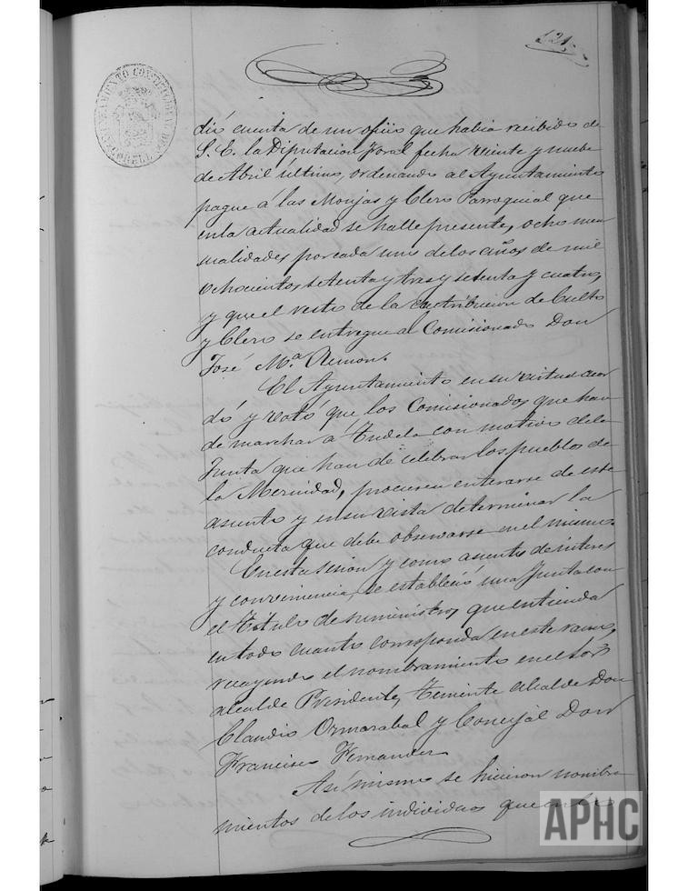 Se informa de oficio de la Diputación, ordenando se abone a las Monjas y Clero Parroquial, que en la actualidad se halle presente, 8 mensualidades por cada uno de los años 1873 y 1874, y que el resto de la contribución del Culto y Clero, se entreguen al Comisionado de la Diputación José Mª Remón. Se acuerda que los comisionados que van a asistir a reunión de la Junta de Merindad a Tudela, se enteren de este asunto para su conveniente resolución. Se acuerda la constitución de una Junta con la denominación de Suministros, que entienda de todo lo relativo a este ramo, recayendo el nombramiento en el Alcalde-Presidente, Teniente alcalde Claudio Ormazábal y el Concejal Francisco Fernández. Se nombran a los miembros de la Junta Auxiliar de Beneficencia y que son: Presidente Claudio Ormazábal, Vicepresidente Claudio Díaz, Vocales Tiburcio Ayala, Apolonio Jiménez, Dionisio Viscasillas, Jenaro Viscasillas, Ildefonso Díaz, los dos Titulares de Medicina y Cirugía y el Párroco de San Miguel. Se acordó que el próximo domingo se realice la subasta para suministro de las raciones de pan y vino que se necesiten para el Ejército y que este Ayuntamiento debe facilitar. Se acordó el nombramiento de un nuevo Alguacil en la persona de Melitón González, con la asignación de 6 reales diarios, siendo tres los alguaciles en las actuales circunstancias.