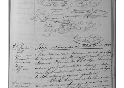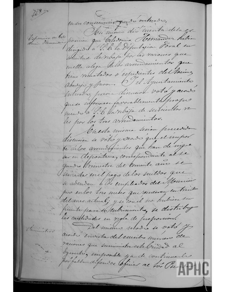 Se recibe escrito del Maestro Epifanio Azcona, con otro de la Dirección General de Instrucción Pública por el que se le conceden tres meses de licencia, a contar desde el 23 del mes pasado. El Ayuntamiento quedó enterado.Se informa del escrito remitido por Celedonio Hernández, rematante de los impuestos sobre el tocino, abadejo y jabón, solicitando rebaja de los mismos y el Ayuntamiento acuerda informar favorablemente, proponiendo a la Diputación una rebaja de 600 reales por los tres arrendamientos. Se acuerda que de los ingresos que deben producirse por los arriendos municipales, se dediquen al abono de los sueldos que se adeudan a los empleados del Municipio por los tres meses que vencerán el día 30 de este mes y de no ser suficiente se abone en regla de proporción. En vista del excesivo número de raciones que suministra la Ciudad al Ejército, imposible ya de continuar por falta de fondos, se acuerda oficiar al Presidente de la Junta de Merindad, para que convoque reunión de los pueblos de dicha Merindad, para tratar el asunto. Se acuerda solicitar al Gobernador de la Provincia su influencia, para cubrir la vacante de notario existente, por abandono del ejerciente José Perula. Se acuerda gratificar al Alguacil Hilario Garbayo con 60 reales, por los servicios prestados en los 30 días de suspensión impuestos a su compañero Calixto Sobejano.