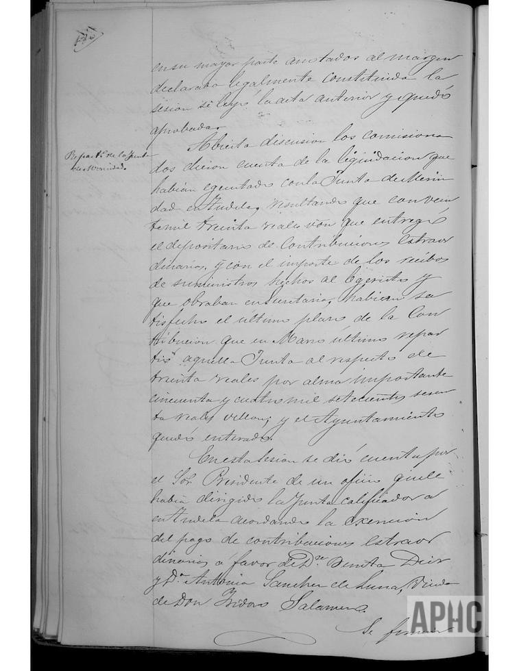 Los Comisionados Tiburcio Ayala y el Secretario del Ayuntamiento, dieron cuenta de la gestión encomendada y explicaron que con 20.030 reales que les entregó el Depositario y con el importe de los recibos de suministros realizados al Ejército y que obraran en Secretaría, habían satisfecho el último plazo del reparto del pago de 30 reales por alma, importante 54.760 reales. El Ayuntamiento quedó enterado. Se informa de oficio remitido por la Junta Calificadora en Tudela, acordando la exención del pago de contribuciones extraordinarias a favor de Benita Díez y Antonia Sánchez de Luna, viuda de Isidoro Salamero.