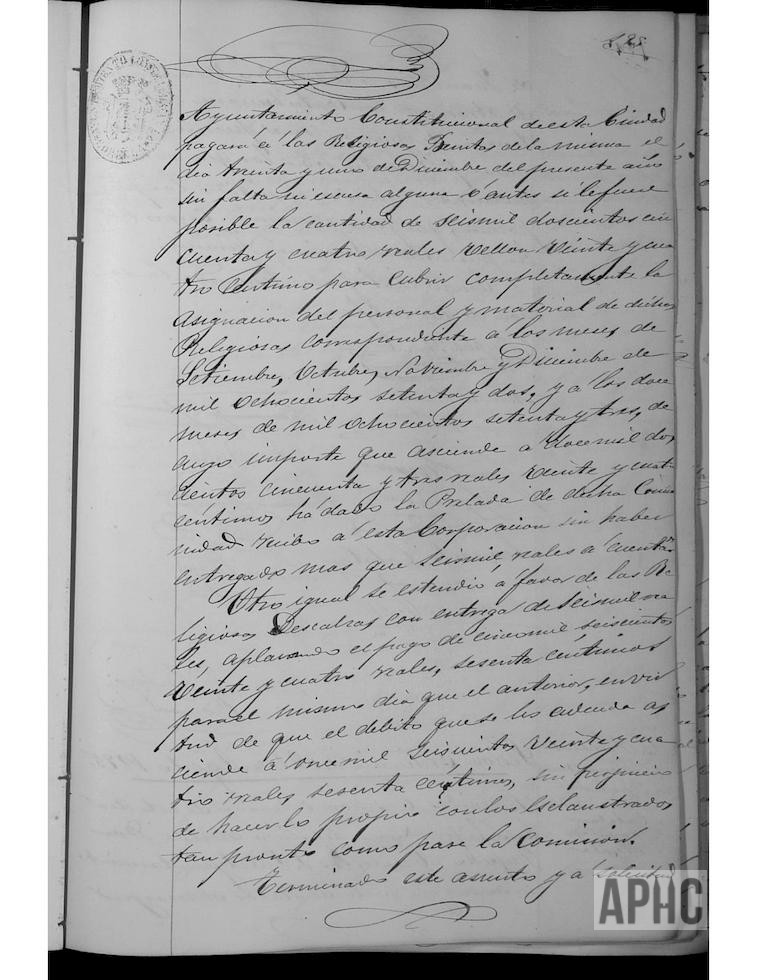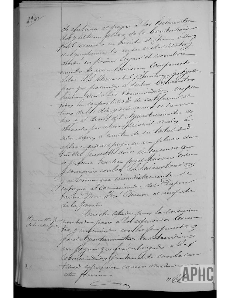 Se trata del pago a los dos Conventos de esta Ciudad y de los fondos de que se puede disponer, insuficiente para cubrir su totalidad si también había de realizarse el pago a los Conventos Enclaustrados y último plazo de la Contribución Foral plazo vencido el 30 de Junio último; y el Ayuntamiento, en su vista, acuerda nombrar una comisión compuesta por los Sres. Ormazábal, Jiménez y Ayala, para que pasando a dichos conventos, hicieran ver a las Comunidades respectivas, la imposibilidad de atender el pago de los 16 meses adeudados, y el deseo del Ayuntamiento de abonarles 6.000 reales a cada uno, a cuenta de la totalidad de lo adeudado, aplazando el pago dentro del presente año; que se procurase lo mismo con los Enclaustrados y que inmediatamente se entregue al Comisionado de la Diputación José Remón, el importe de la Contribución Foral. Se procedió a redactar los documentos oportunos con el reconocimiento de la deuda y el compromiso de satisfacerla antes del 31 de diciembre del año actual, a favor de la Religiosas Benitas (San Benito), por importes de 6.254,24 reales por los meses de Septiembre a Diciembre de 1872 y de 12.253,24 por el año 1873, de cuyo importe ha dado recibo la Prelada a esta Corporación, sin haber entregado más que 6.000 reales a cuenta. Otro documento similar se extendió para las Religiosas Descalzas (Araceli), con entrega de 6.000 reales, aplazando el pago de 5.624,60 reales para su abono antes del 31 de diciembre del año actual, ya que la deuda total asciende a 11.624,60 reales; acordándose hacer lo propio con los Enclaustrados, tan pronto como pase la Comisión. A solicitud de Juan Ríos, se le nombra recaudador de atrasos de las Contribuciones extraordinarias de guerra, con el premio del 9% sobre los que resulten morosos. No se admitieron las proposiciones presentadas por Severino Jiménez.