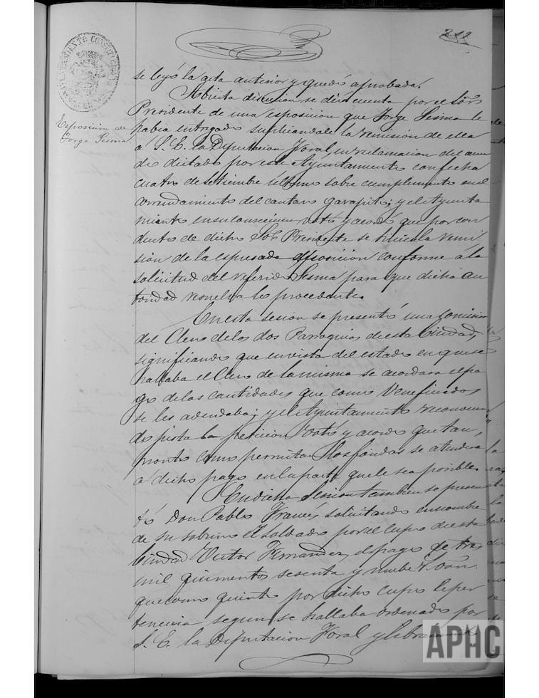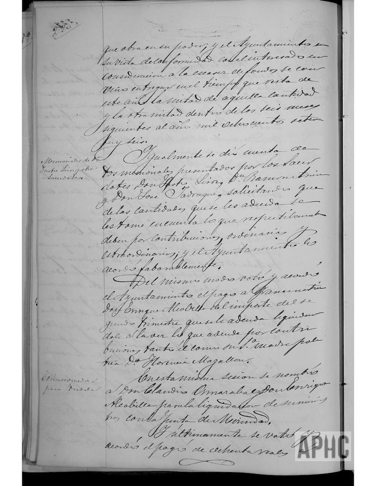 Se informa de escrito de Jorge Sesma, rematante del impuesto de cántaro garapito, para remitir a Diputación, sobre reclamación que formula, para resolución por dicha Autoridad. Presentada una comisión del Clero de las dos Parroquias, solicitando el abono de las cantidades que se les adeuda como Beneficiados, se acuerda que se atienda este pago tan pronto permitan los fondos y en la cantidad que sea posible. Pablo Francés, solicita en nombre de su sobrino Víctor Fernández, soldado de cupo de esta Ciudad, la cantidad de 3.569 reales, que como quinto le correspondía, de conformidad con lo ordenado por la Diputación; el Ayuntamiento acuerda, en vista de la escasez de fondos, entregar en el tiempo que queda de año, la mitad de lo solicitado y las otra mitad en los 6 primeros meses del año 1876. Escrito de los sacerdotes Justo Liroz, Ramón Asiain y José Jadraque, solicitando que de las cantidades que se les adeudan, se les tome en cuenta lo que deben por contribuciones ordinarias y extraordinarias; el Ayuntamiento lo aprobó favorablemente. Se acuerda el pago del segundo trimestre al Farmacéutico Enrique Alcobilla, liquidándole a su vez lo que adeude por contribuciones tanto él como su madre política Florencia Magallón. Se nombra a Claudio Ormazábal y Enrique Alcobilla, para que realicen la liquidación de suministros con la Junta de Merindad. Se acuerda el abono de 80 reales a cada uno de los bagajeros que están de servicio en Tafalla.