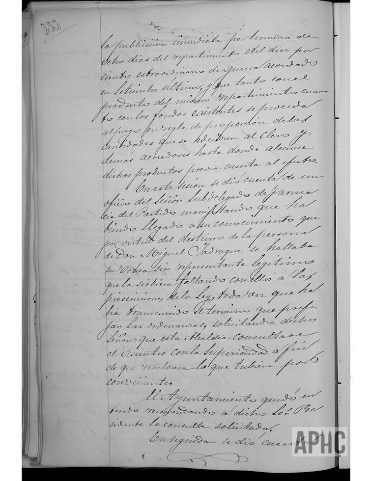 A la vista de los escasos fondos existentes y para poder afrontar pagos necesarios, se acuerda la publicación inmediata en el término de 8 días, de la imposición del 10% de impuesto extraordinario de guerra, acordado en Septiembre último y que con los fondos existentes y lo recaudado, se proceda al pago, en regla de proporción de las cantidades que se adeudan al Clero y demás acreedores, hasta donde alcancen dichos fondos. Se informa de oficio del Subdelegado de Farmacia del Partido, manifestando tener conocimiento de que por virtud del destierro de Miguel Jadraque, estaba su Botica sin representante legítimo que la sirviera, faltando con ello a las prescripciones de la Ley, toda vez que se había transcurrido el plazo fijado en las ordenanzas, solicitando que esta Alcaldía consultase con la Superioridad, para resolver lo conveniente; el Ayuntamiento quedó enterado, recomendando al Alcalde-Presidente realice la consulta solicitada. Se informa de escrito que la Comunidad de Religiosas Carmelitas Descalzas (Araceli), solicitando que se les hiciese pago, cuando menos, de la mitad de las cantidades que se les adeudaban; el Ayuntamiento acuerda que tan pronto como se ingresen fondos, se pague la cantidad que sea posible.