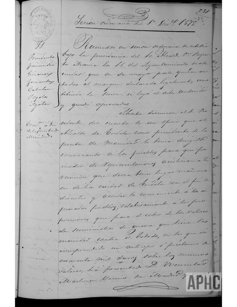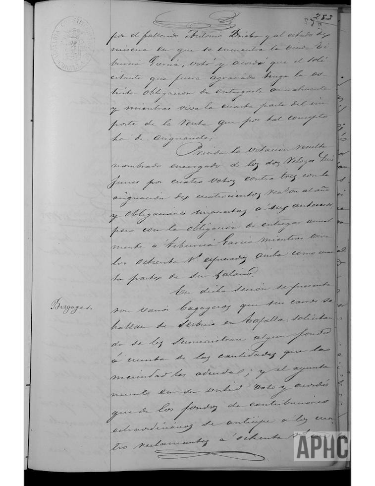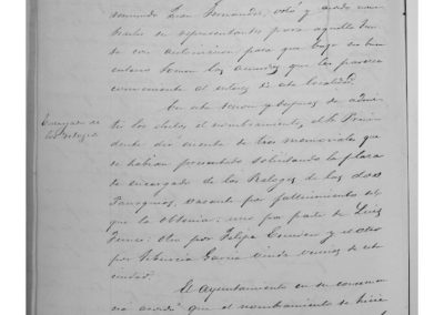Se recibe oficio del Alcalde de Tudela como Presidente de la Junta de Merindad, convocando a los pueblos de la misma, a reunión, para tratar sobre las proposiciones para el cobro de los valores de suministros al Ejército que tiene la Merindad contra el Estado, en las que va comprendido un anticipo a cuenta o préstamo de 40.000 duros (200.000 pesetas), que sobre dichos valores ha presentado Wenceslao Martínez, vecino de Madrid; se comisiona al Alcalde y al Teniente alcalde Beremundo Juan Fernández, para que acudan a dicha reunión, con la autorización de que tomen las decisiones más oportunas, para el interés de la Ciudad. Se informa de tres solicitudes para encargado de los relojes de las dos parroquias, vacante por fallecimiento del actual encargado; una solicitud de Luis Funes, otra de Felipe Escudero y una tercera de Tiburcia García, viuda, todos vecinos de esta Ciudad. El Ayuntamiento considera excluir a Tiburcia García, por las circunstancias que el empleo exige, pero en atención a los buenos servicios prestados por el fallecido Antonio Nieba, esposo de Tiburcia García y el estado de miseria en que se queda dicha viuda, se acuerda someter la designación a votación entre los dos primeros solicitantes y que el agraciado tenga la obligación de entregarle anualmente y mientras viva, la cuarta a parte de la renta que se le asigne. Sometido el asunto a votación salió elegido por 4 votos frente a 3, Luis Funes, por una asignación de 400 reales anuales, con la obligación de entregar a Tiburcia García, anualmente y mientras viva, la cantidad de 80 reales, como cuarta parte de su salario. Se entregan a los bagajeros de servicio en Tafalla, la cantidad de 80 reales a cada uno a cuenta de las cantidades que les adeuda la Merindad.