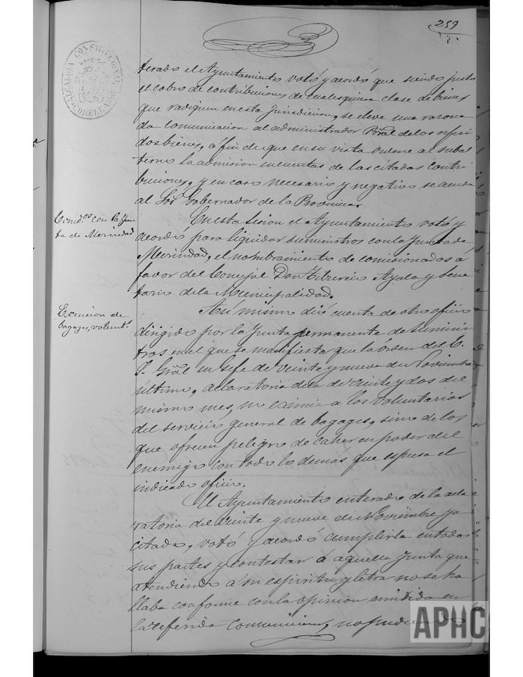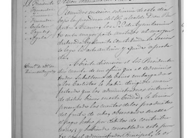 Se informa de oficio del Administrador Subalterno de bienes embargados a los Carlistas, sobre las cuentas presentadas por los administradores interinos y observando que de dichos bienes y productos se habían descontado las deudas por contribuciones que los Carlistas debían al Municipio, solicitando su envío inmediato, bien por la Alcaldía como por los interesados; el Ayuntamiento acordó se elevase un escrito al Administrador Principal, indicando que se considera justo el cobro de contribuciones de cualesquiera clase de bienes que radiquen en esta Jurisdicción, caso de contestación negativa al efecto, se oficiaría al Gobernador de la Provincia. Para la liquidación de cuentas con la Junta de Merindad, se designan al Concejal Tiburcio Ayala y al Secretario de la Corporación. Se recibe oficio de la Junta Permanente de Suministros, manifestando que la orden del General en Jefe, sobre no eximir a los voluntarios del servicio general de bagajes, del cobro de contribuciones de guerra, sino sólo a los que ofrecen peligro de caer en poder del enemigo; el Ayuntamiento acuerda manifestar a dicha Junta que no estando conforme con dicha decisión, no podía consentir la salida de voluntarios de bagajes al puesto de Tafalla, de donde, naturalmente, salían hacia otros sitios a prestar el servicio, siempre expuestos a caer en poder del enemigo.