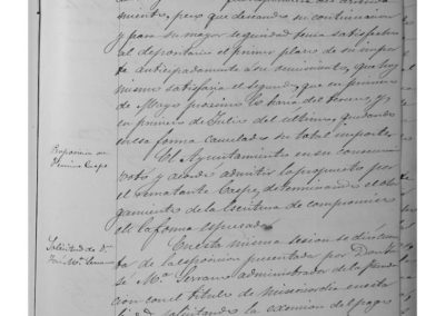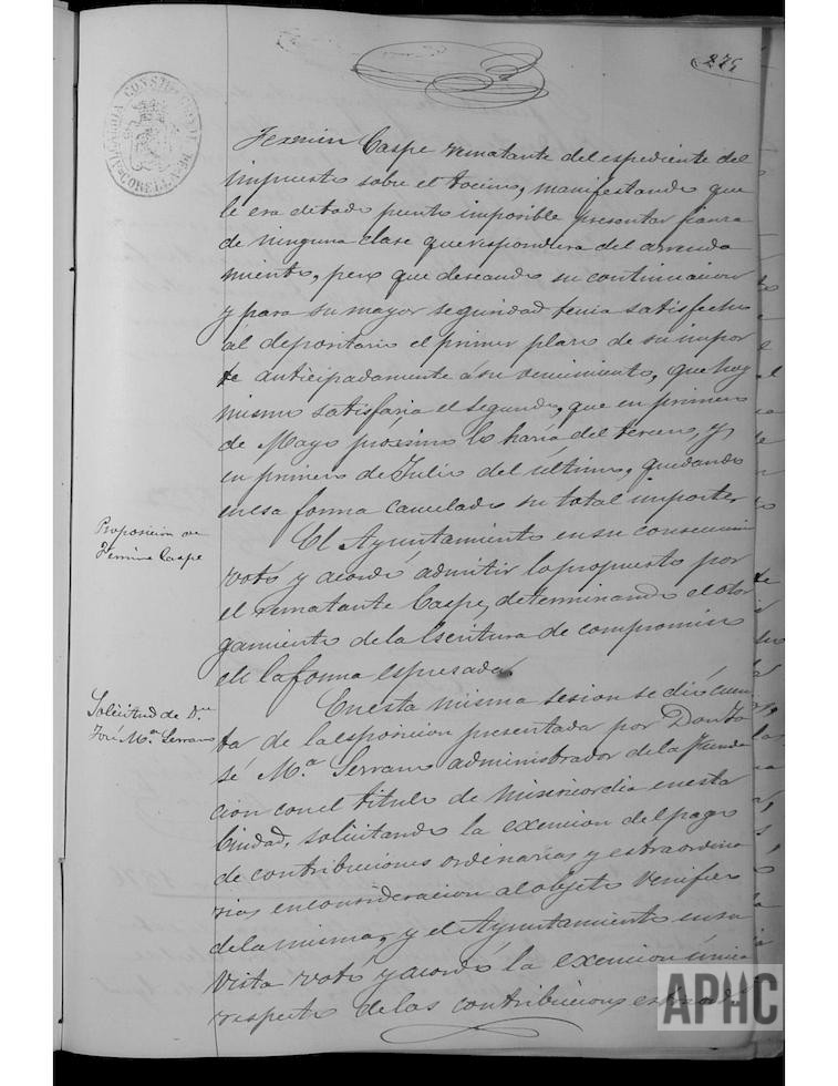 Se acuerda la imposición del 5% sobre la riqueza territorial, industria y comercio, para poder atender las cantidades que se adeudan por Contribución Foral y de Culto y Clero. El Notario Ramón de Miguel, presenta varias escrituras de arrendamientos para su otorgamiento. El rematante del expediente del impuesto sobre el tocino, Fermín Caspe, manifiesta que le es imposible presentar fianza que respondiera de dicho arrendamiento, pero que deseando su continuidad y para seguridad, había entregado al Depositario el primer plazo de su importe, anticipadamente a su vencimiento, que hoy mismo abonaría el segundo, que en 1º de mayo abonaría el tercero y el 1º de julio abonaría el último, quedando de este modo cancelado el total. El Ayuntamiento admitió dicha propuesta, formalizando el documento oportuno. El Administrador de la Fundación con el título de Misericordia, solicita la exención de pago por contribuciones ordinarias y extraordinarias, en consideración al objeto benéfico de dicha fundación; el Ayuntamiento acordó su exención, sólo de las contribuciones extraordinarias. Se acuerda dejar nulo y sin ningún efecto, el arrendamiento del impuesto sobre varios artículos que remató Calixto Sobejano, por no presentar fianzas con arreglo a las condiciones de dicho expediente. Se acuerda anunciar nuevamente dicho arrendamiento.