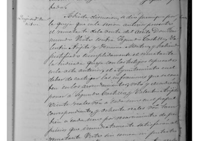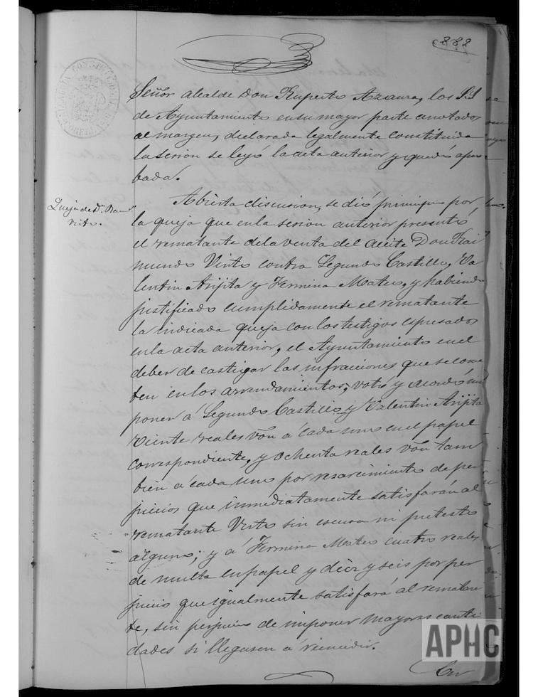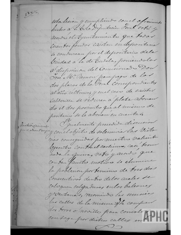 Vista en la sesión anterior la reclamación de Raimundo Virto, referente al arrendamiento de la venta de aceite al por menor, comprobadas las pruebas y declaraciones de los testigos, acuerda imponer a Segundo Castillo y Valentín Arigita, una sanción de 20 reales a cada uno, y la cantidad de 80 reales, también a cada uno, que por resarcimiento de perjuicios, abonarán sin excusa ni pretexto alguno al rematante Raimundo Virto y a Fermina Mateo, multa de 4 reales y 8 reales que abonará a dicho rematante, sin perjuicio de imponer mayores cantidades si llegasen a reincidir. Se acuerda que cuantos fondos existan en Depositaría, se entreguen al comisionado de la Diputación en Tudela José Mª Remón, para pago de los dos plazos de la Contribución Foral, correspondientes a 1875, y en el caso de existir calderilla (moneda pequeña de cobre), se cambie por plata, abonando el 2% que al mismo depositario se le abonarán en cuenta. Se acuerda la celebración de actos por las victorias sobre el Ejército Carlista, por estar casi finalizada la guerra.