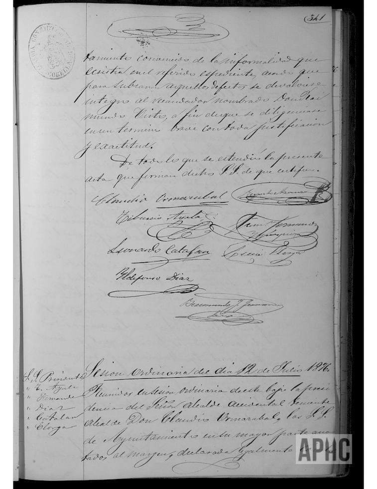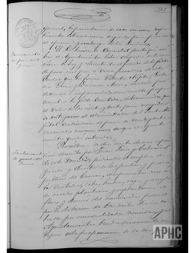 Los comisionados Claudio Ormazábal y Tiburcio Ayala, para revisión de las obras a realizar en el Matadero Municipal (ubicado en Plaza Baja, en el río Molino/Ampol), informan de la necesidad urgente de ciertas reparaciones y que el Maestro de Obras, Marcos Sánchez, acometería a la mayor brevedad. Se solicita una lista de morosos al recaudador de contribuciones. Se informa de que se había detectado un fraude en el peso del pan de las panaderías de Valentín Arigita, Gervasio García y Dámaso Añón, imponiéndose las correspondientes multas, siendo decomisados dichos panes y disponiendo que el importe de su venta se entregase al Administrador del Santo Hospital. Se informa de solicitud formulada por Juan Sanz Cabañas, del cargo de encargado del mantenimiento y custodia de los jardines y paseo del Carmen, por la cantidad de 3 reales diarios, cobrados por meses vencidos, y considerando ventajosa la proposición, se acuerda su nombramiento, comprendiendo las labores de riego, arreglo de hiedras y plantación de flores, debiendo estar constantemente a la vista y custodia de los jardines y arbolado.