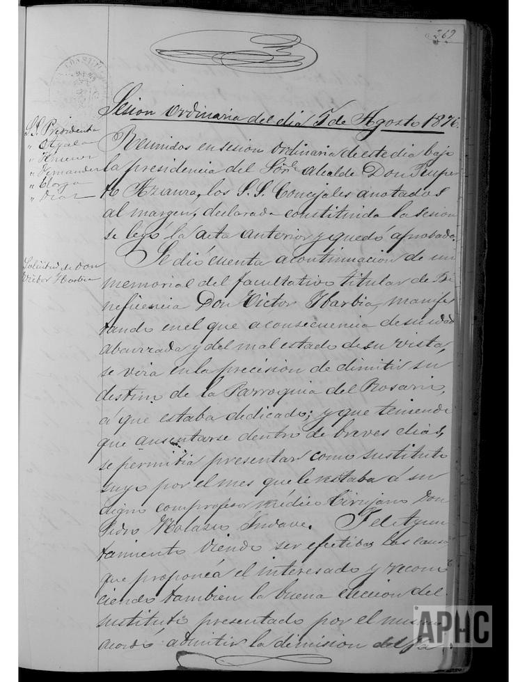 El Médico titular Víctor Ibarbia, manifiesta que por su avanzada edad y sus problemas de vista, tenía que presentar su dimisión de su destino de la Parroquia del Rosario, y teniendo que ausentarse por unos días, presentaba al médico Pedro Nolasco Indave, como su sustituto por el mes que restaba del cumplimiento de su contrato; el Ayuntamiento encuentra razonables sus exposiciones y acertada la sustitución propuesta, encontrando de conformidad ambas propuestas y comunicar al Gobernador la vacante producida para su anuncio en el Boletín Oficial. Escrito de Nicolás Mateo Salvador, recordando al Ayuntamiento su propuesta para custodia de los campos con responsabilidad de los daños, y que no había obtenido respuesta alguna; el Ayuntamiento le contesta que el asunto había pasado a la Junta de Agricultura para su informe. Se acuerdan varios asuntos sobre el cobro de contribuciones y comunicar a Raimundo Virto esas decisiones y recordarle que debe otorgar con toda urgencia la escritura de fianza.