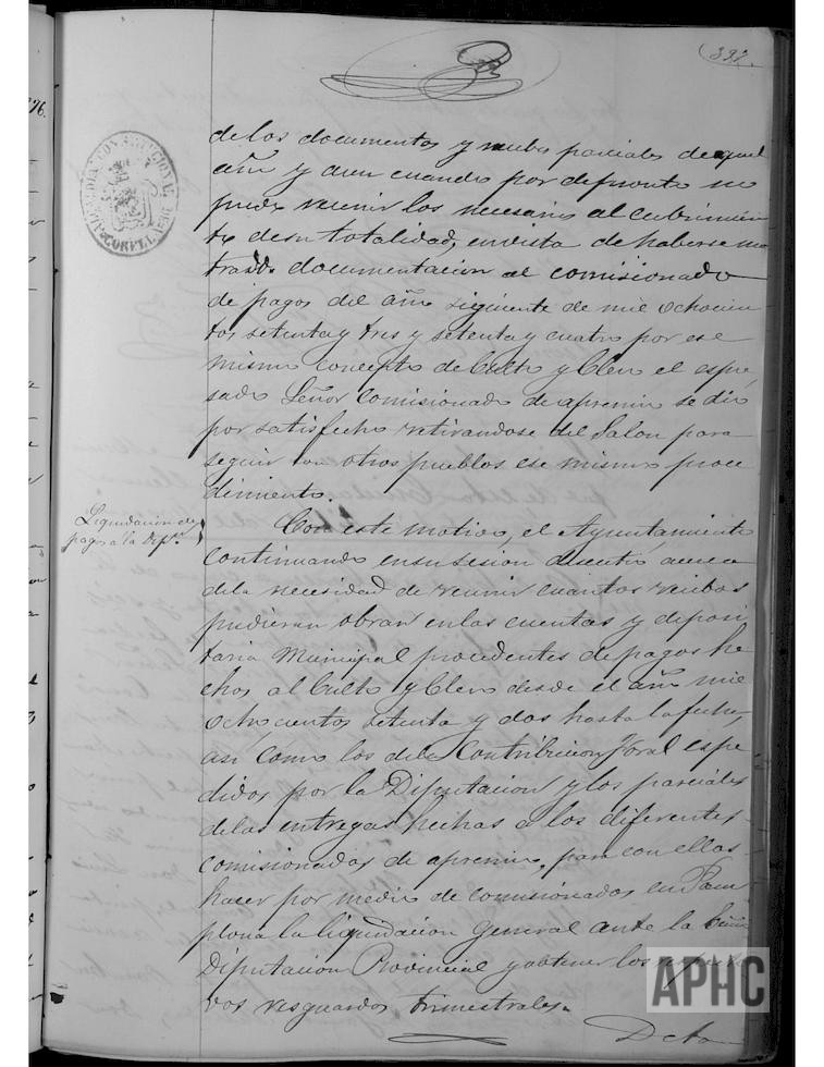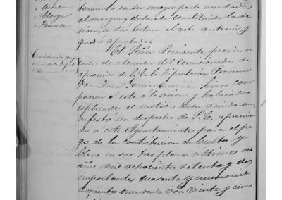 El Comisionado de Apremio de la Diputación, Juan García Ozcoidi, expone escrito de dicha Autoridad, apremiando el pago de la Contribución de Culto y Clero en sus tres plazos últimos del año 1872, por un importe de 49.211,25 reales. El Ayuntamiento, teniendo el convencimiento de haber abonado dicho impuesto y año, recabó documentación, pudiendo presentar incluso de años posteriores, con lo que el Comisionado, se dio por satisfecho y se retiró del salón de sesiones para seguir en otras poblaciones, ese mismo procedimiento. Se acuerda recabar y reunir todos los recibos de pago de los distintos plazos de contribución de Culto y Clero, así como de la Foral y una vez reunidos los justificantes oportunos, nombrar comisión para acudir a Pamplona a realizar una liquidación general de cuentas, con la diputación Foral.