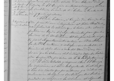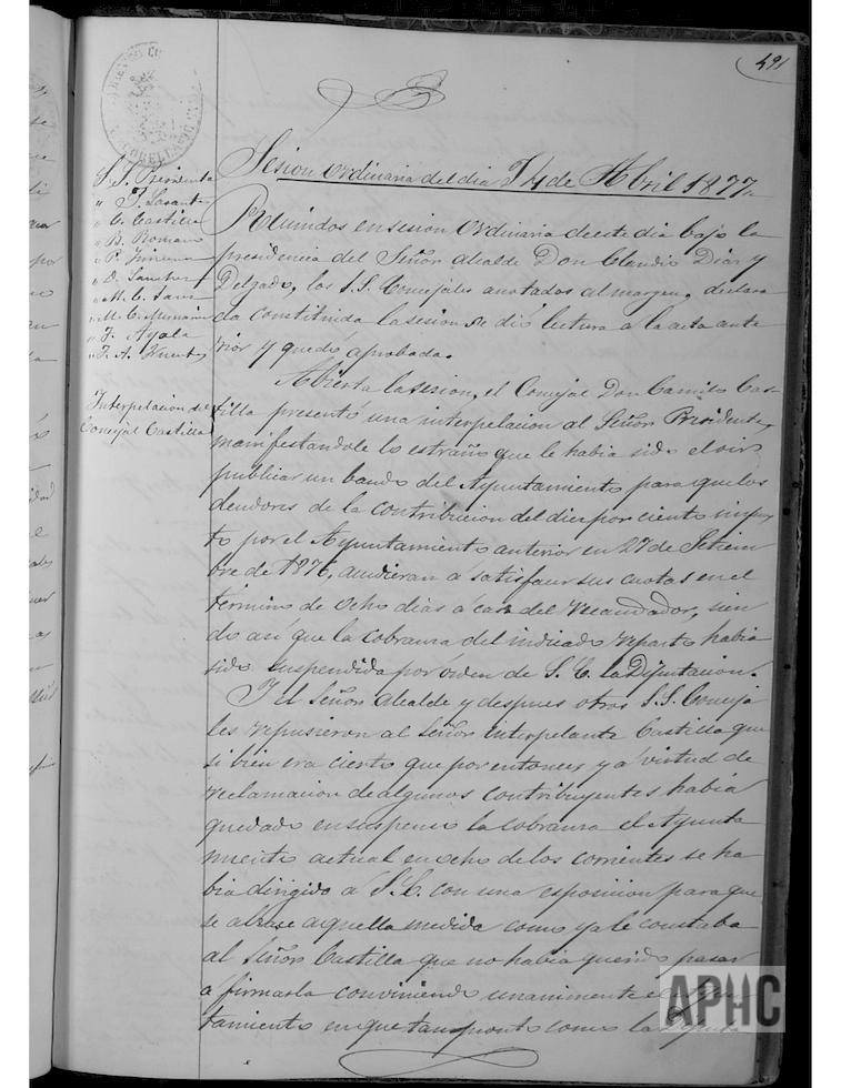 El Concejal Camilo Castilla, presenta una interpelación al Alcalde, ante su extrañeza al oír publicar un bando para que los deudores de la contribución del 10%, impuesto por el Ayuntamiento anterior, acudieran a casa del recaudador para abonar sus cuotas en el plazo de 8 días, siendo así que la cobranza del indicado impuesto había sido suspendida por la Diputación. El Alcalde y compañeros de Corporación del Sr. Castilla, le manifestaron que el Ayuntamiento con fecha 8 de los corrientes había dirigido un escrito a la Diputación para que anulase dicha suspensión, como ya le constaba al Sr. Castilla, que no había querido pasar a firmarla y la Diputación había accedido a lo solicitado por la Diputación, por cuyo motivo se había proclamado los bandos. El Alcalde, para constancia de todos los Concejales, informa del Decreto de la Diputación favorable a la cobranza de la contribución del 10% antes aludida, y de que se admitiesen, en la forma en que se hallan confeccionadas, las cuentas del Depositario de Propios y Contribuciones de los años 1872 a 1876, inclusive que todavía no habían sido presentadas en la Contabilidad de dicha Institución, leyéndose las dos indicadas exposiciones y sus decretos, quedando informada la Corporación. Se informa de oficio del Gobernador de la Provincia, como Presidente de la Junta de Instrucción Pública de la Provincia, nombrando para la Junta Local al Párroco de San Miguel, Liborio Zueco García, al Concejal Tiburcio Ayala y a los padres de familia José Mª Serrano, Joaquín José Octavio de Toledo y Tomás Escudero, remitiendo las oportunas credenciales. Se acuerda que, con respecto a la fianza que, para el cargo de Depositario que se anunciaba, consistía en 50.000 reales.