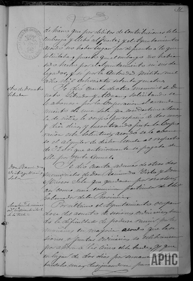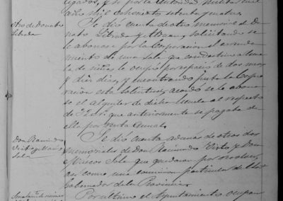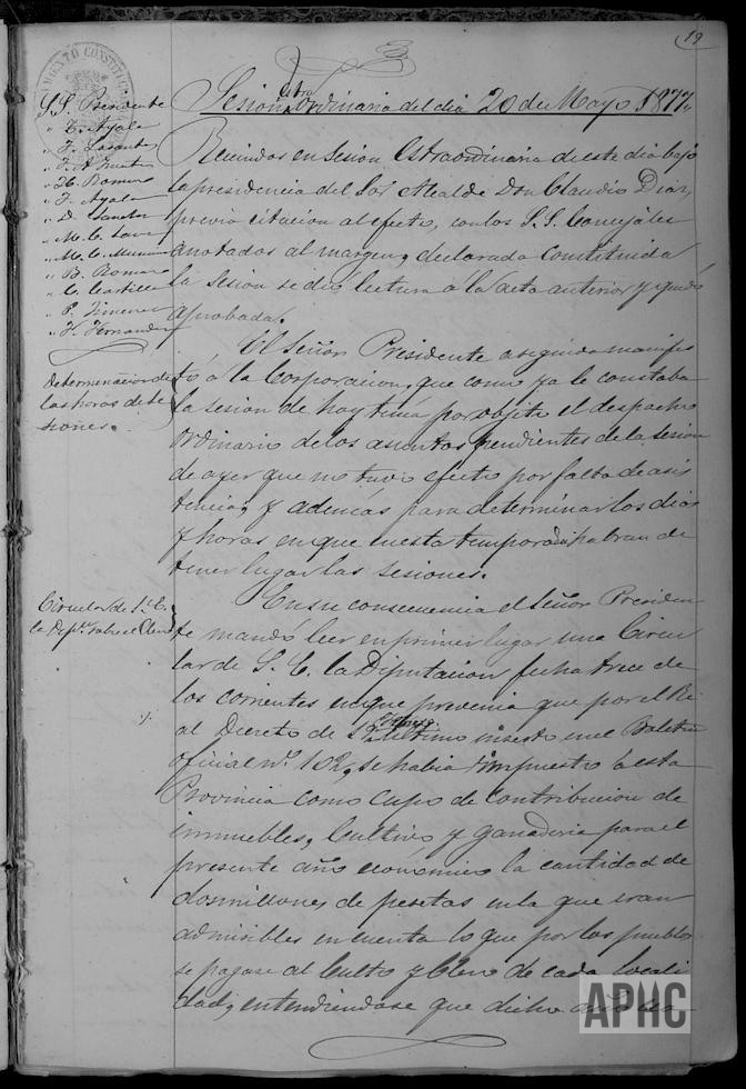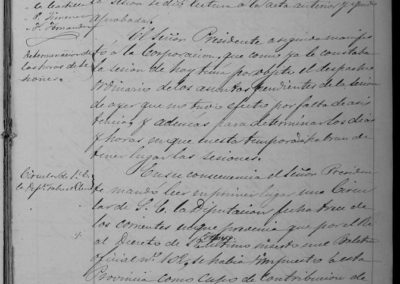 Enterados de escrito de S. E. la Diputación, sobre establecimiento del Impuesto como cupo de Contribución de Inmuebles, Cultivo y Ganadería, se acuerda se procederá a su abono cuando avise dicha entidad. Escrito de León Crespo, que fue desterrado el año 1875, solicitando que al igual a otros vecinos de esta misma condición, se le ajuste el cobro de Contribución de Guerra, a lo que se accede. Escrito de Ignacia Liñán, viuda, solicitando exención de algunos impuestos, se accede en parte. Escrito de Donato Librada Alduán, solicitando abono de cantidad por ocupación de dos meses y días una sala de su propiedad, para escuela de niños. Se accede a lo solicitado. Escritos de Raimundo y Marcos Sola, sobre asuntos pendientes de resolver. Se acuerda que las sesiones ordinarias pasasen a celebrarse a las cinco de la tarde y una semanal, que serían los miércoles, dejando sin efecto las sesiones de las mañanas y las dos semanales.