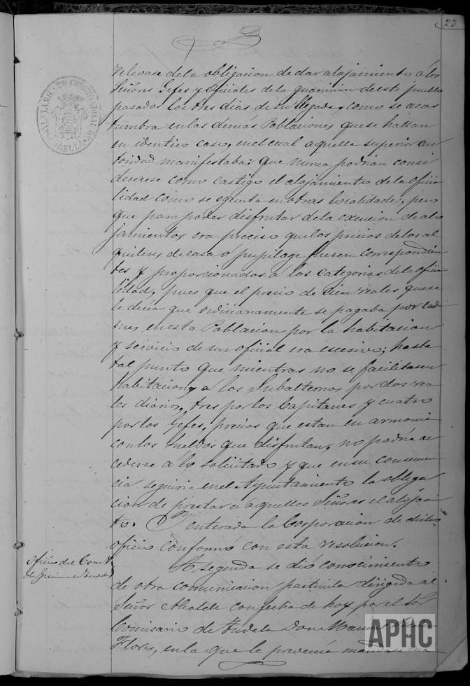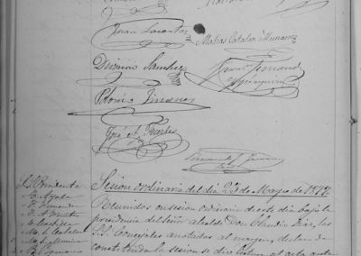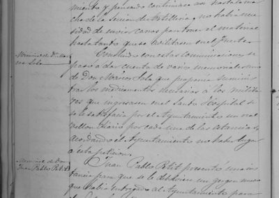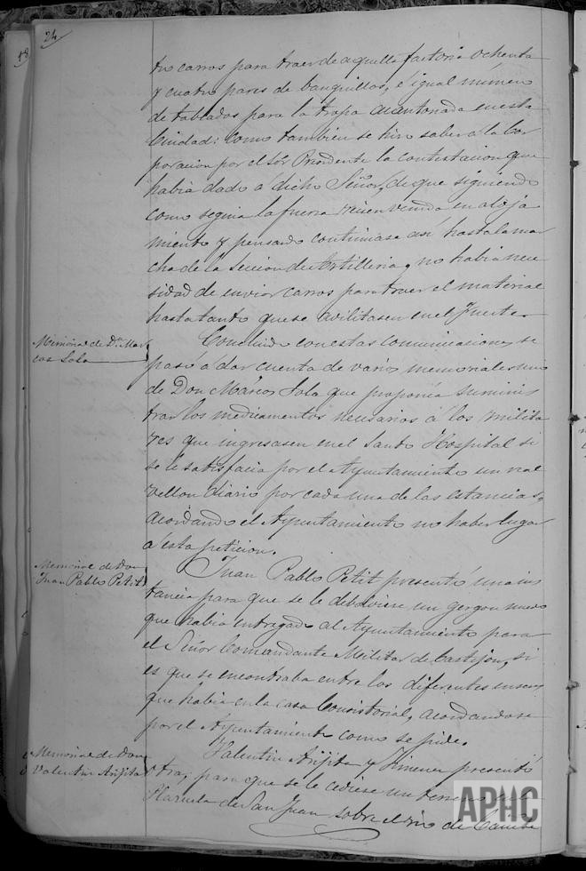 Escritos y consideraciones sobre alojamiento de Jefes, Oficiales y Subalternos de la Guarnición de la población. El Farmacéutico Marcos Sola, solicita se le abone cierta cantidad por medicamentos suministrados a los militares ingresados en el Hospital; se acuerda no haber lugar. Escrito de Juan Pablo Petit, solicitando devolución de material, entregado al Ayuntamiento para el Comandante Militar de Castejón; se accede a lo solicitado. Solicitud de Valentín Arigita Jiménez, para que se le cediese un terreno en la Plazuela de San Juan sobre el río Cañete, comprometiéndose a cubrir dicho cauce, en las condiciones que estableciese la Corporación; se acuerda pase a Comisión para estudio e informe. (Entiendo que esta Plazuela de San Juan, se refiere a la que existiría delante de la ermita de “San Juanillo”, es decir al final del Barrio Verde, junto a las Tajadas). Escritos de Venancio Ayala y otro de Felipe Atienza Bermejo, exponiendo que habían sido desterrados el año 1875 y solicitaban exenciones de contribuciones; se accede. Ante el mal estado en que se encuentran varias calles y las próximas procesiones del Corpus, se acuerda arreglar el trozo especialmente de la calle Mayor, desde el Crucero al Barrio Verde y hasta la Plaza, que es el que se encuentra en peor estado.