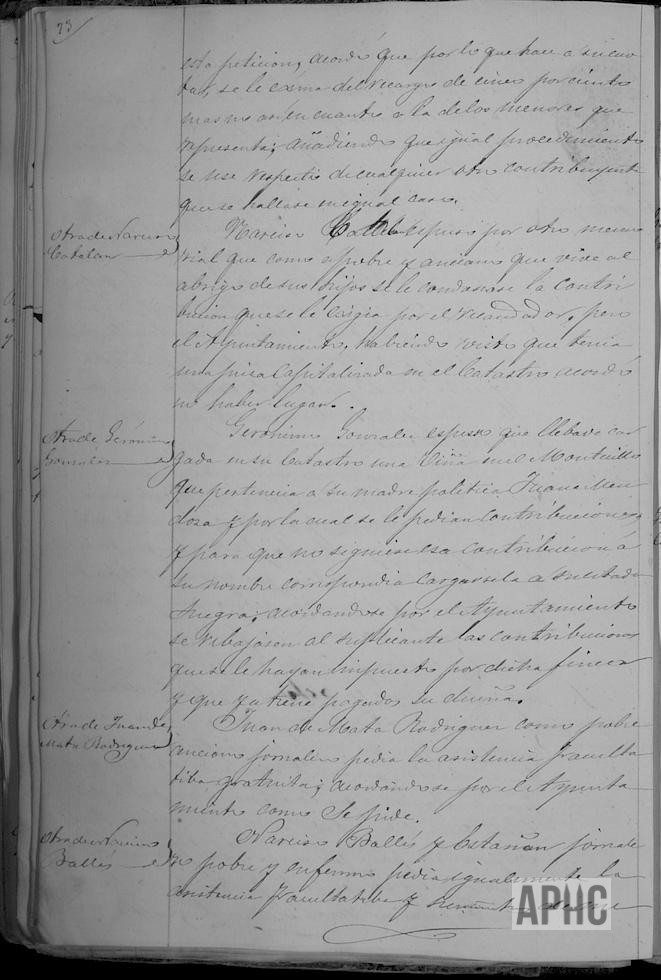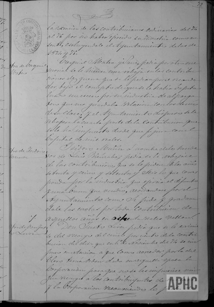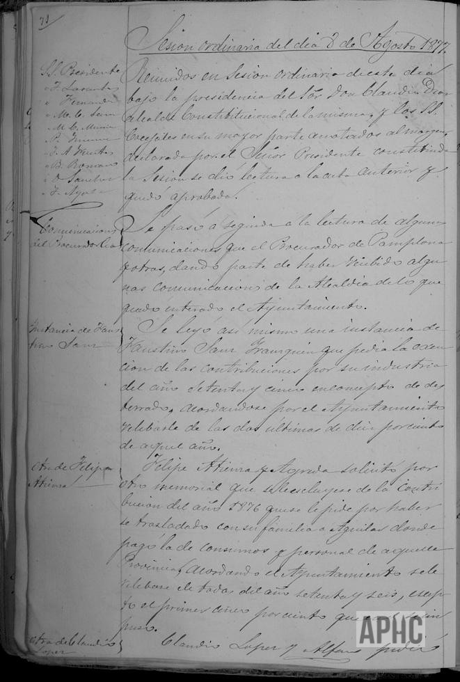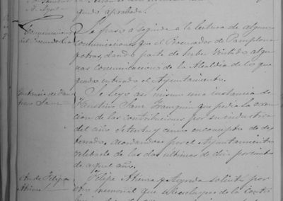 Solicitud de Faustino Sanz Irauzquin de exención de contribución de su industria, por el tiempo que ha estado desterrado, accediendo a la solicitud. Solicitud de Felipe Atienza Ágreda, de exención de la contribución de 1876, por haber residido con su familia en Aguilar (del río Alhama) y haber pagado allí. Solicitud de Claudio López Alfaro, de exención de las contribuciones de los años 1874 a 1876, por no haber ejercido su industria, por estar ausente. Solicitud de Ezequiel Mateo Sanz, de rebaja de la contribución de guerra, de su negocio de Alpargatero, por haber valorado en exceso su negocio; el Ayuntamiento accede. Escrito de Isidoro Muñoz, en nombre de herederos de Luis Bienzobas, solicitando rebaja de la contribución de los años 1875 y 1876, por la industria que ejercía el difunto y una burra que vendió; se accede a la rebaja correspondiente. Se tramitan varios escritos en este sentido presentados por Justo Liroz, otro de Narciso Catalán, otro de Jerónimo González; acordando las resoluciones pertinentes. Se considera realizar una solicitud a la Diputación para la construcción de un ramal de enlace con la carretera de Grávalos, en el término del Ombatillo, en el punto de la Venta llamada “del Pillo”.