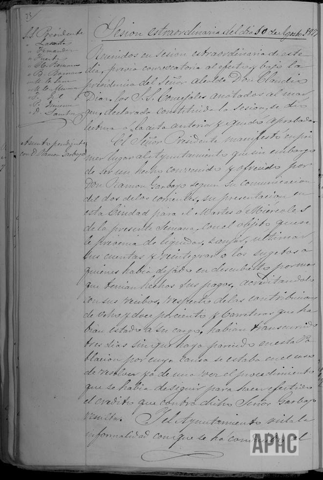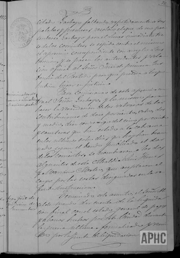 Ante la informalidad por su no presentación en el Ayuntamiento para zanjar varios asuntos, se acuerda tomar las acciones pertinentes contra Ramón Garbayo, que fue secretario de este Ayuntamiento. Se encomienda a los Alguaciles Luis Funes y Mariano Mateo, la cobranza de contribuciones atrasadas. Se cursa una solicitud a la Diputación para la construcción de un ramal de carretera que partiendo de Corella, por el camino y término del Ombatillo, conectase en la Venta llamada “del Pillo”, con la carretera construida recientemente desde Alfaro a los Baños de Grávalos, procurándose trabajo a corellanos, que habían sufrido una gran pérdida económica por daños causados por el pedrisco.