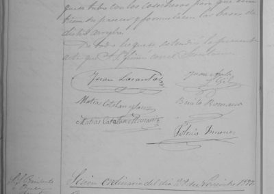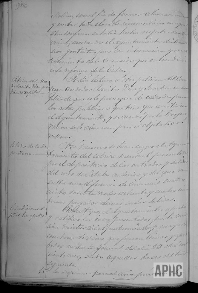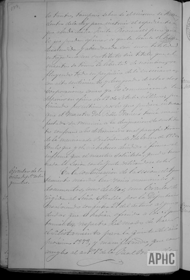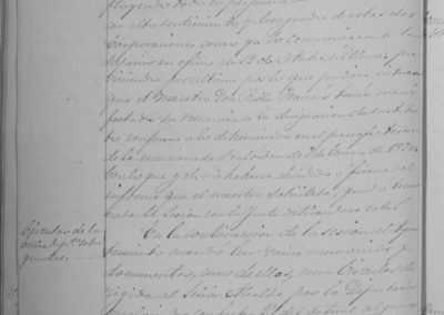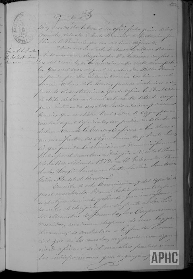 Oficio de la Junta Provincial de Instrucción sobre asunto del Maestro Pablo Francés. Se contesta que a la Corporación ni le consta ni puede afirmar con seguridad si dicho maestro padece o no las indisposiciones que aqueja, desconociendo si se encuentra dentro de la Ley, para instruir dicho expediente. Lo que sí puede afirmar la Corporación es que la Escuela se halla desatendida y abandonada casi en su totalidad, entregada a un sustituto sin título que dicho maestro se tomó la libertad de nombrar, con total desagrado de esta Corporación, como ya se comunicó a esa Junta Provincial. Comunicación sobre modo de realizar el alistamiento de mozos para el año 1878. Escrito de Jenaro Viscasillas, en nombre de Matías Pascual, solicitando un trozo de terreno en calle de la Conejera a espaldas de una casa de su propiedad en calle del Molino. Solicitud del Conserje Andador Benito Díaz Sánchez, para que se le proporcione calzado para la asistencia a los actos oficiales. Se acuerda se le abona una cantidad. Se establecen la normativa para recaudación del impuesto de garapito o su sustituto.