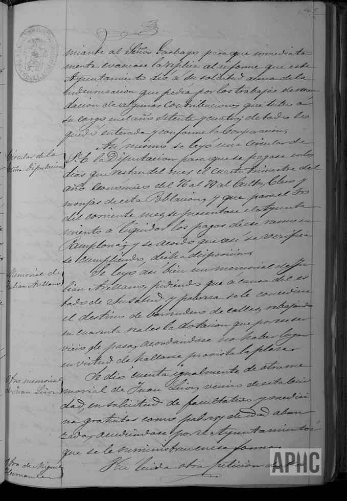 Oficio de Tudela, con instrucciones del Gobernador, sobre Censo electoral en terrenos de Bardenas, Montes de Cierzo y Argenzón, solicitando reunión. Se nombra Comisión. Solicitud de Pascual Garbayo para edificar en calle Santa Bárbara y sitio de la huerta del ex convento de la Merced. Se concede con ciertas condiciones.