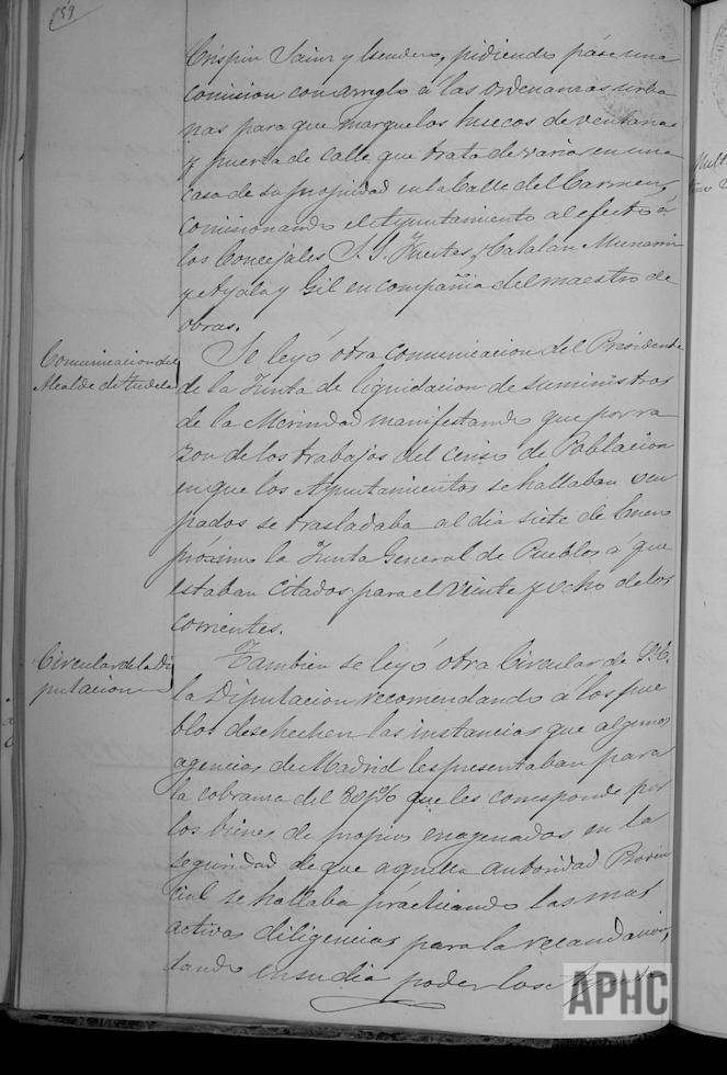 Crispín Sáinz Escudero, solicita se le marquen los huecos de ventanas y puerta, en su casa de calle del Carmen. Se nombra Comisión para informe. Sobre discrepancia en cobro del impuesto sobre aceite y multa a Faustino Sanz.