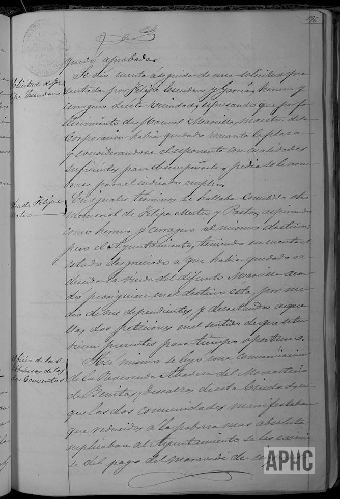 Se reciben dos solicitudes, una de Felipe Escudero García y otra de Felipe Mateo Pastor, para el cargo de Maestro Cerrajero que había quedado vacante por fallecimiento del titular Manuel Marcilla. Se acuerda lo siga desempeñando su viuda y los dependientes, en vista del estado lastimoso en que había quedado su viuda. No obstante las peticiones se tendrían en cuenta en su momento. Solicitudes de las Abadesas del Monasterio de Benitas (San Benito) y Descalzas (Araceli) para que ante la pobreza en que se encuentran, se les exima del pago del impuesto sobre el pan que se cuece en los hornos de la Ciudad. Se acuerda que se tendrá presente en el momento del arriendo de dicho impuesto.