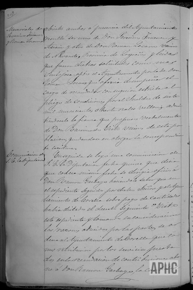 Se adjudica a Román Lozano, vecino de Navarrete, Logroño, el cobro de Contribuciones. Comunicación de la Diputación respecto a deuda de Ramón Garbayo Romeo a Corella.