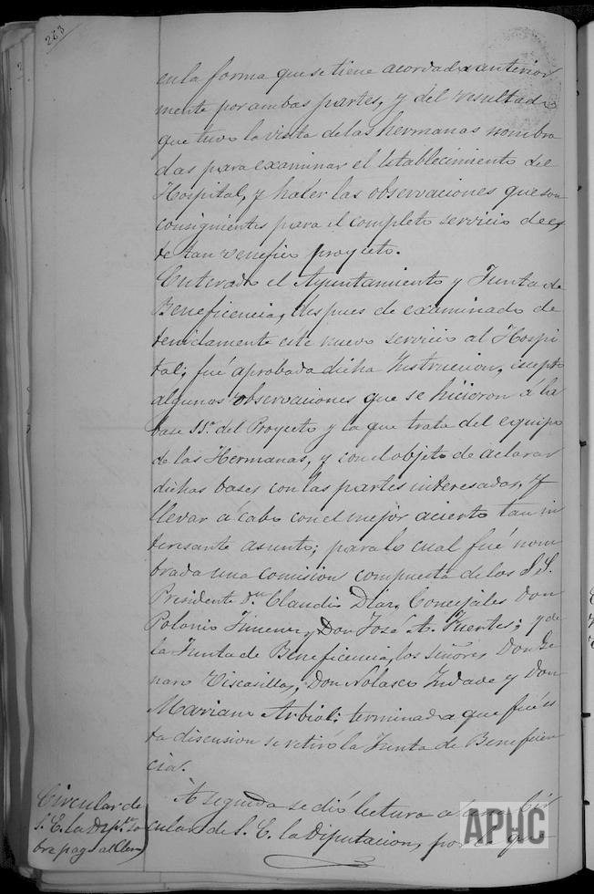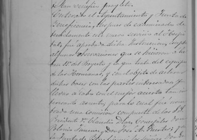 Se nombra Comisión para negociar el contrato de asistencia al Hospital de las Hermanas de la Caridad, a propuesta de Matías Pascual Val, que se compromete a sufragar los gastos durante diez años.