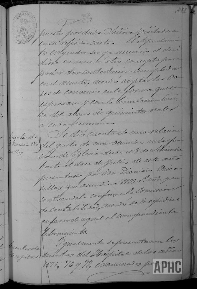 Mostrando conformidad al Convenio para que tres Hermanas de la Caridad prestasen servicio en el Hospital. Abono de la cuenta de Dionisio Viscasillas, por consumo de cera en actos del Ayuntamiento. Aprobación de cuentas del Hospital.