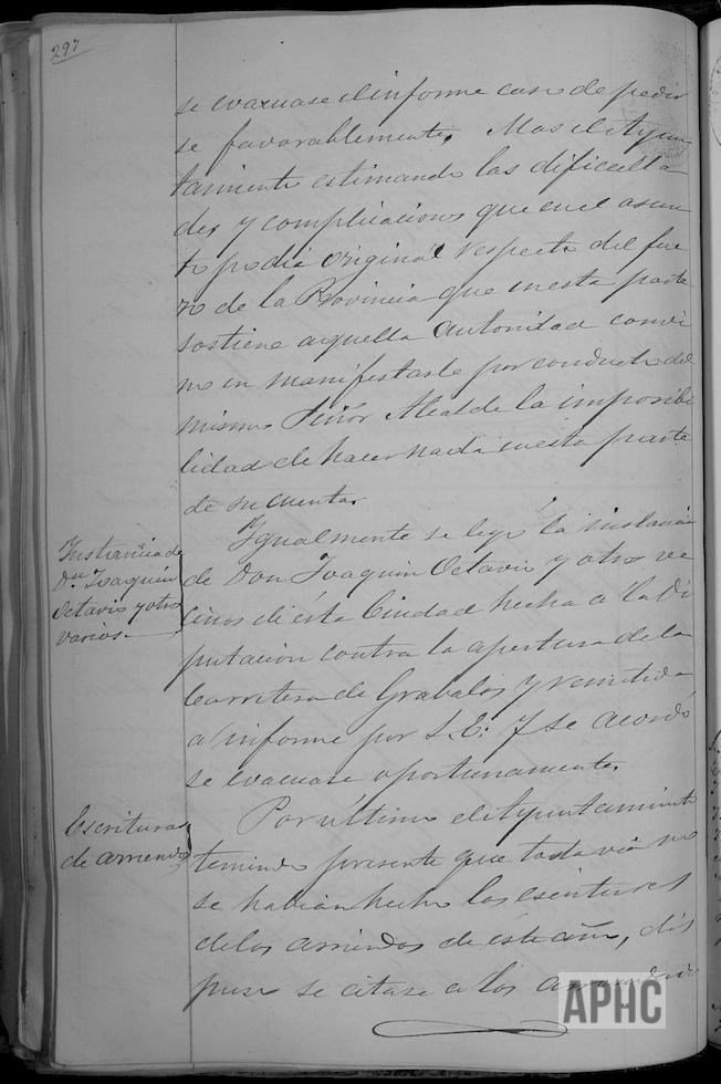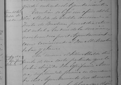 Sobre medición y tasación de los sotos de Paula Echevarne, Marcelina Bissié y Micaela Marichalar, próximos al puente sobre el río Alhama. Nombramiento de comisionado par asistencia en Tudela a reunión de Junta de Bardenas. Escrito de Epifanio Azcona, solicitando el cargo de Maestro. Se le indica que no está en la mano del Ayuntamiento, pronunciarse sobre este tema. Escrito de varios vecinos contra la apertura de la carretera de Grávalos.