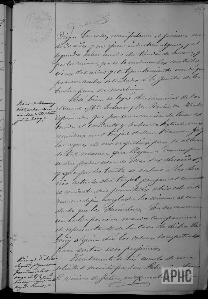 Nombramiento de Depositario de Propios a favor de Manuel Jiménez Ayala, vecino de la Ciudad. Escritos de Julián Vicente, manifestando que no ejerce industria alguna y Diego González, comunicando que ha cerrado su tienda de abacería. Que ambos escritos pasen a Junta de Catastro. Escrito de Manuel Mª Ardanaz y Raimundo Virto, sobre obstrucción de conducto público del sumidero del trujal de Francisco Goñi, afectando a las aguas de sus respectivos pozos. Se ordena la reparación oportuna al representante del Sr. Goñi. Escrito de Saturnino Sagasti, vecino de Fitero, en representación de Severo Sagasti, de Pamplona, sobre liquidación de pagos por contribuciones ordinarias y extraordinarias.