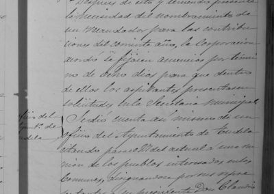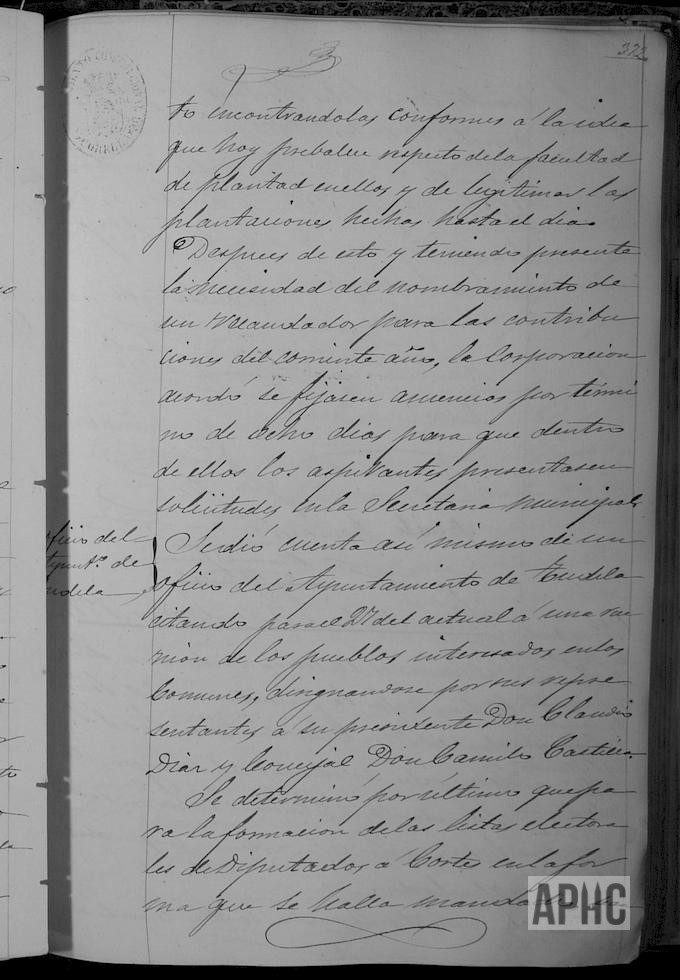 Informe sobre las nuevas bases para el aprovechamiento de los montes comunes. Se acuerda anuncio para el puesto de Recaudador de Impuestos. Se nombra Comisión para reunión en Tudela de los pueblos implicados en los montes comunes. Se determina, conforme mandato, que en la lista para electores a Diputados en Cortes, figuren los vecinos que en Catastro tengan un Capital imponible de 600 reales o superior.