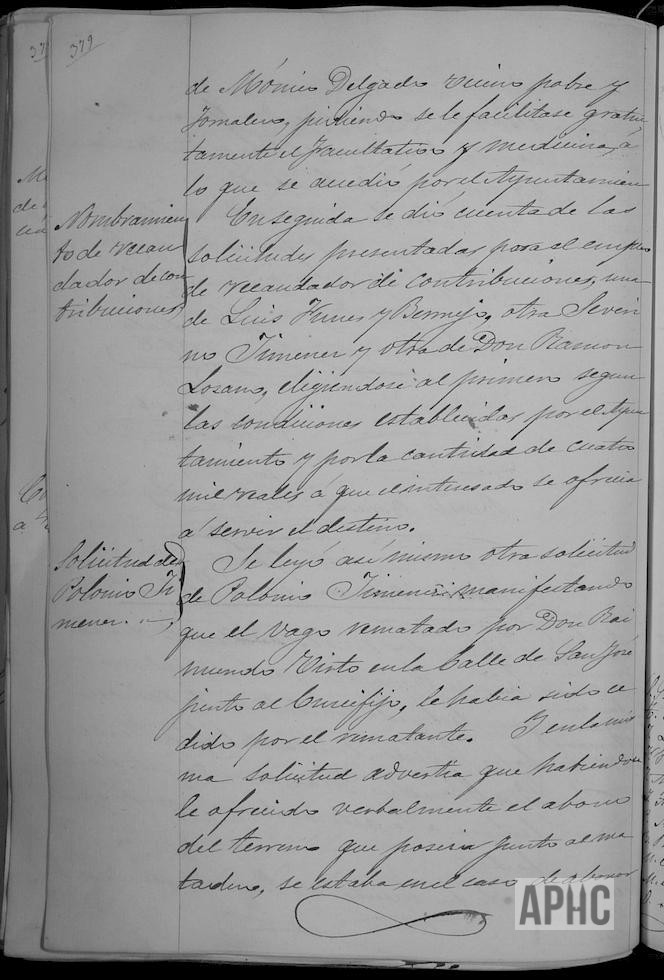 Nombramiento para Recaudador de Contribuciones a Luis Funes Bermejo. Escrito de Polonio Jiménez, exponiendo que el solar adquirido por Raimundo Virto, en la calle San José, junto al Crucifijo, le había sido cedido por el Sr. Virto y notificaba también en este escrito oferta verbal sobre terreno que tenía junto al matadero. Se nombra Comisión para informe.