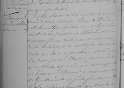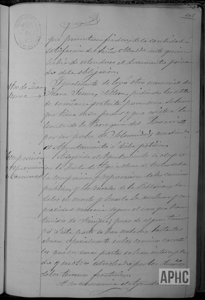 Escrito de Juan Atienza y Antero Alfaro, padres de soldados de remplazo destinados en Cuba, solicitando abono de anticipo de mil reales que les corresponden al año y día para poder libertar por medio de sustituto del servicio a sus respectivos hijos en Ultramar (Se llamaba así a los territorios de España en las Antillas, Cabo Juby, Cuba, Fernando Poó, Filipinas, Puerto Rico y otras posesiones). Se acuerda su abono y practicarlo también al resto de padres en iguales condiciones. Abonándose los 40 duros restantes, ya que los otros 10 duros se les abonaron con su entrada en Caja. (50 duros igual a 250 pesetas e igual a 1.000 reales. Actualmente 1,50 Euros ¡Aclaración para jóvenes, que no conocieron la peseta!). El Ayuntamiento se ocupó con la Junta de Agricultura de nombrar Comisión para informe sobre la composición y arreglo de caminos públicos y rurales, dándoles en monte y huerta la anchura y capacidad necesaria, según el uso que han tenido de siempre, para evitar los abusos producidos en algunos caminos carretiles, donde se han interceptado o estrechado por dueños de terrenos fronterizos. Se acuerda que estos trabajos se realicen en época de pocas labores de campo, para mejor compaginar con jornaleros locales y que por los términos se abonasen cantidades para sufragar estos gastos. Se acuerda se comience por el camino que de Araceli se dirige a Araciel, el trayecto que media hasta la Laguna, se pasase por el término de Cañete y de ahí abajo por el término de Araciel.
