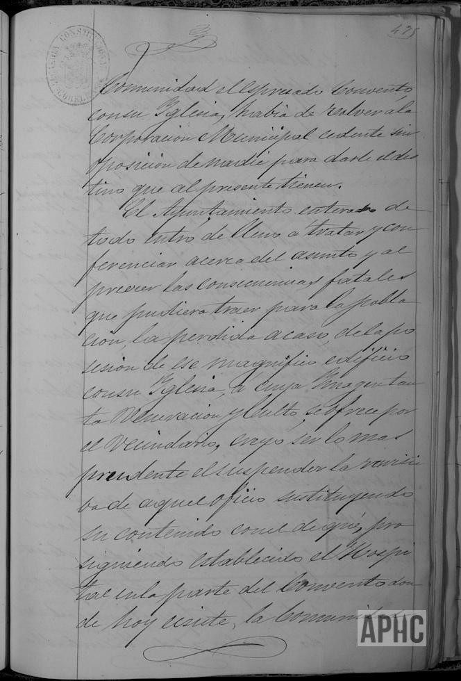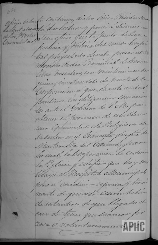 El Alcalde informa sobre el nombramiento para el puesto de Sereno a Julián Atienza Díaz y suplente a Zacarías Delgado. Se pone en conocimiento de la Corporación, Oficio que la Junta de Beneficencia y Fábrica del nuevo Hospital pensaba remitir al Provincial de los Carmelitas Descalzos con residencia en Marquina, indicando que podía gestionar ante el Gobierno de Su Majestad, el permiso para establecer una Comunidad de Religiosos de su Orden en el Convento que fue de Ntra. Sra. del Carmen, para lo cual el Ayuntamiento cedería la Iglesia y edificio que hoy constituye el Hospital Municipal, con la condición expresa y terminante de que en esta cesión habría de entenderse de que llegado el caso de tener que evacuar forzosa o voluntariamente la Comunidad el expresado Convento con su Iglesia, había de volver a la Corporación Municipal cedente, sin la oposición de nadie, para darle el destino que al presente tienen. La Corporación debate el asunto en profundidad y valora las consecuencias fatales que para la población puede suponer la pérdida, acaso, del edificio con su iglesia y hospital, por lo que se acuerda modificar el contenido del oficio de la Junta de Beneficencia, en el sentido de que los Carmelitas podrían edificar en los terrenos de la huerta existente. Se acepta escrito de Vicente Malumbres, para realización del padrón municipal, que realizará a una con los dos alguaciles.