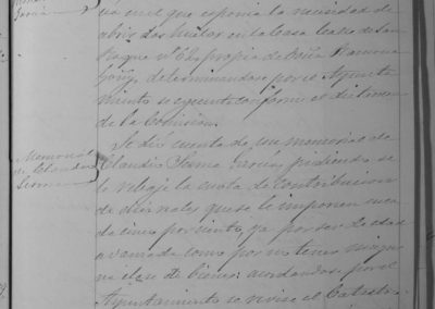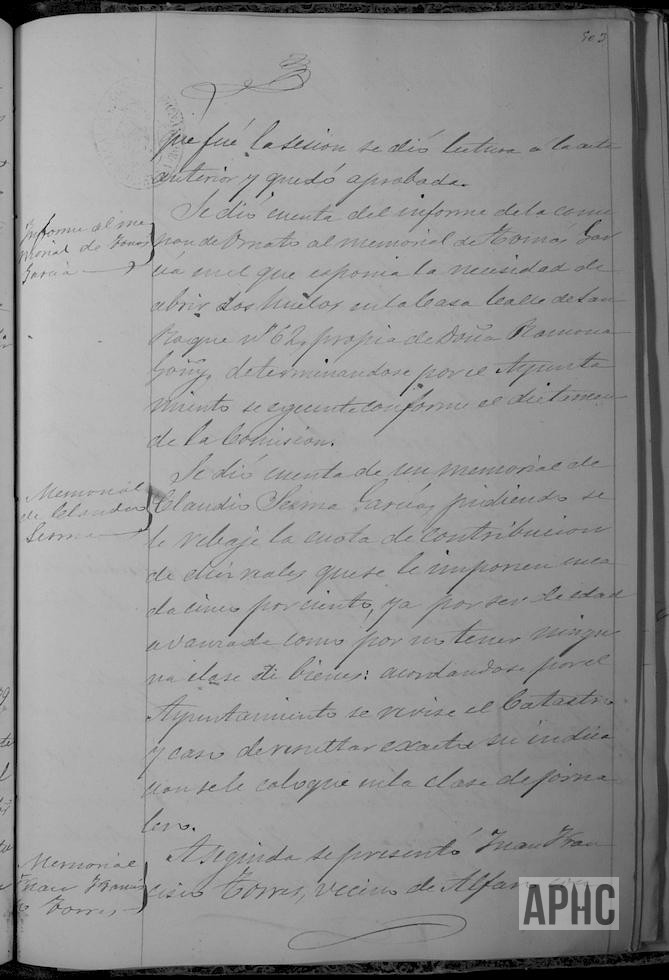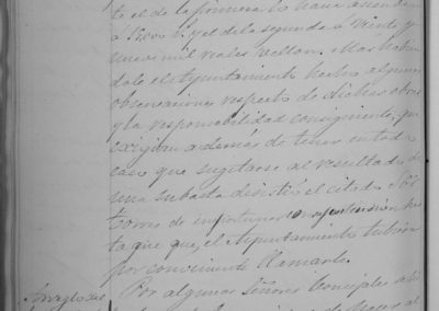 Se autoriza a Tomás García sobre apertura de dos huecos en casa de Ramona Goñi, en calle San Roque Nº 62, conforme al dictamen de la Comisión de Ornato. Solicitud de Claudio Sesma García, para que se le rebaje la contribución. Oferta de Juan Francisco Torres, vecino de Alfaro, sobre proyecto de traída de aguas de la Fuente del Tollo y construcción de lavadero. Tendrá que ofertar en subasta pública. Sobre reparación del banco que la Corporación ocupaba en la Parroquia de Ntra. Sra. del Rosario.