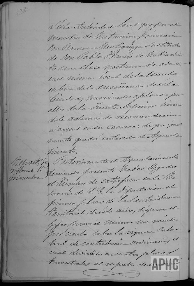 Se manifiesta la conformidad con las cuentas presentadas, así como el ingreso realizado en Depositaría, del Recaudador de Contribuciones de los años 1873 al 76, Raimundo Virto García, dándose las cuentas por canceladas sin ulteriores reclamaciones. Oficio de la Junta Provincial de Instrucción, sobre apertura por parte de Román Mentiguiaga, sustituto de Pablo Francés, de una clase nocturna de adultos, mereciendo el aplauso de dicha Junta, sirviendo además de recomendación en su carrera, de lo que quedó informada la Corporación.