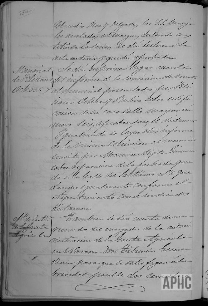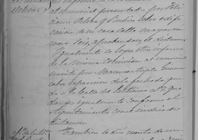 Solicitud de Feliciano Ochoa Rubio, sobre edificación de su casa en calle Mayor Nº 6. Se aprueba con el informe de la Comisión. Se autoriza solicitud de Manuel Arigita Jiménez, sobre reparación de la fachada que da a la calle del Santísimo nº 7, previo informe favorable de la Comisión. Oficio de la Diputación para que se recogiesen los impresos necesarios para realizar las correspondiente modificaciones del censo. Se acepta la dimisión presentada por el Alcalde del Barrio de Castejón, Jerónimo Marco, manifestando que llevaba 16 años desempeñando el cargo, no pudiendo atenderlo ya en razón a sus actuales ocupaciones. El Ayuntamiento la acepta por ser de justicia y realizaría el nombramiento de otra persona que le sustituyese.