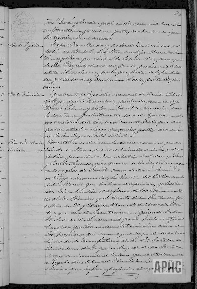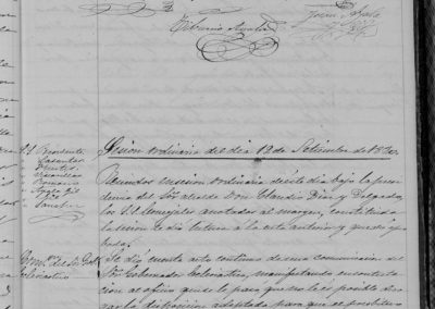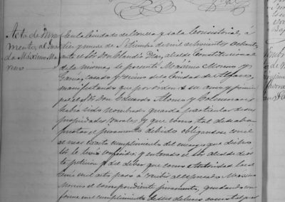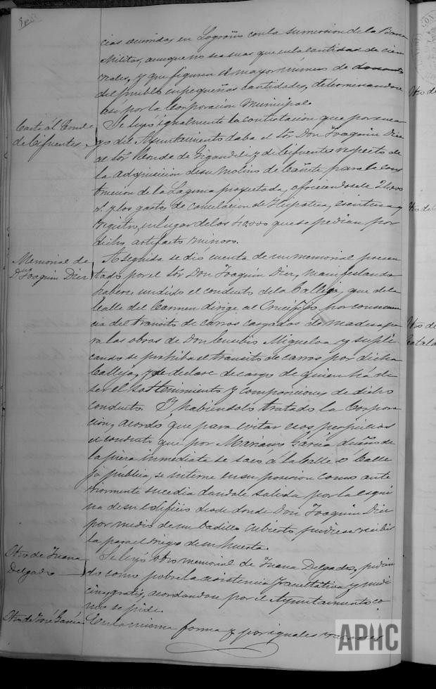Escrito del Delegado Eclesiástico, confirmando que el presbítero Matías Arellano debe celebrar las misas de doce en la parroquia de San Miguel, y deje de celebrar la misa de doce que realiza en la Basílica del Villar, en atención a ser de mayor interés la celebrada en la Parroquia. Se leyó proposición de compra del molino de Cañete propiedad del Conde de Cifuentes, para construcción de una laguna. Escrito de Matías Catalán Sanz y Benito Ayensa, solicitando pudiesen regar con las aguas de Cañete la huerta del Convento de la Merced, que habían adquirido y cuyo riego se producía de tiempo inmemorial. Se autoriza el riego para únicamente de la superficie que anteriormente se regaba y no la totalidad, por los daños que origina. El Ayuntamiento quedó enterado del nombramiento de Máximo Moreno, vecino de Alfaro, como guarda particular de Eduardo Alonso y Colmenares.