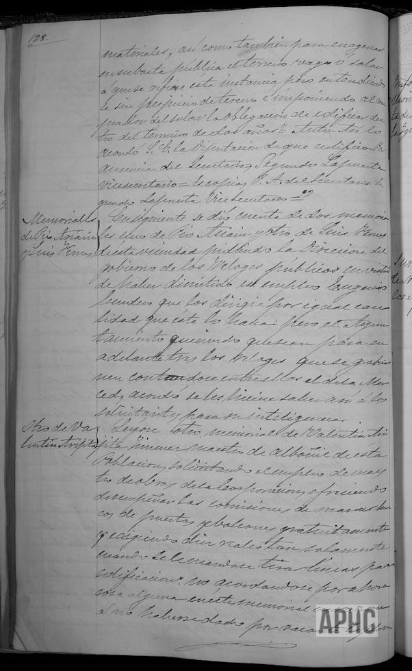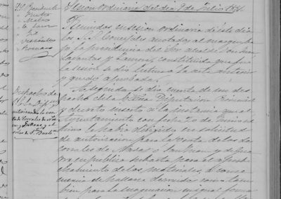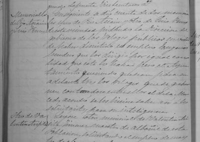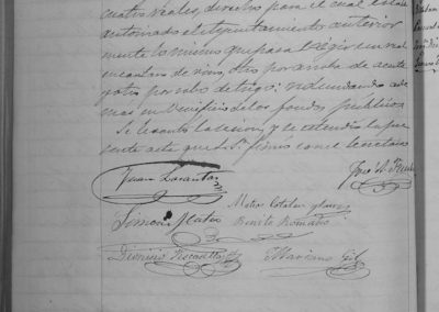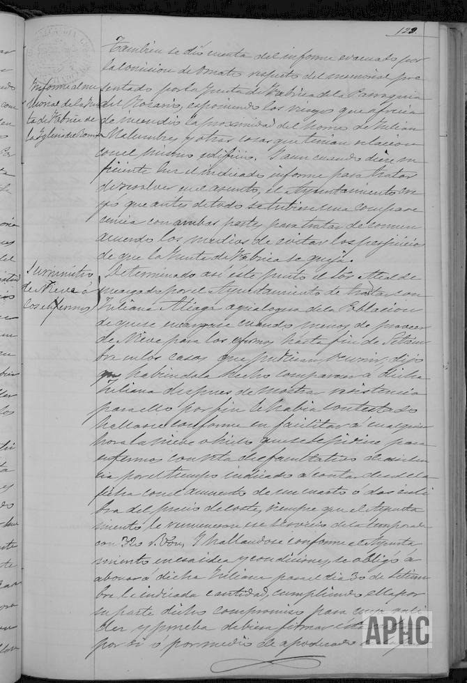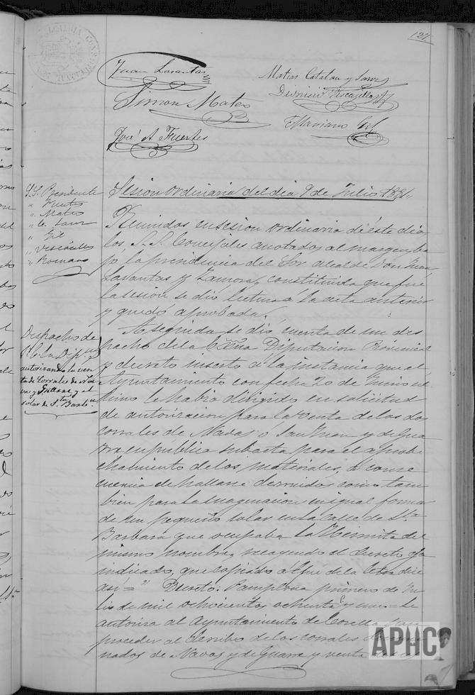 Se recibe escrito de la Excma. Diputación, autorizando venta en pública subasta de corrales de Navas o San Juan y de Guarre, para aprovechamiento de materiales pues están derruidos y pequeño solar en calle Santa Bárbara que ocupaba la ermita de dicha Santa. Escritos de Pío Asiain y otro de Luis Francés para hacerse cargo del mantenimiento de los relojes, acordando el Ayuntamiento que serán tres los relojes ya que se añadirá el de la Merced. Acuerdo del Ayuntamiento con Juliana Aliaga, para suministro de nieve, fijándose nuevos precios. (Existe una nota al final del acta, que cita “Como apoderado de mi Sra. madre Juliana Aliaga” y una firma que se lee “Martín Ausejo”).