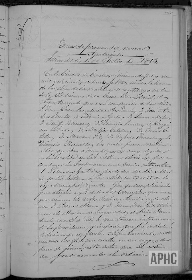 El Ayuntamiento saliente compuesto por el alcalde Juan Lasantas y los concejales José Andrés Fuertes, Tiburcio Ayala, Simón Mateo, Benito Romano, Dionisio Sánchez, Longinos Librada, Matías Catalán, Tomás Catalán, Mariano Gil, Eugenio Hernández y Dionisio Viscasillas, los cuales fueron recibiendo a los que iban a reemplazarles como elegidos en las últimas elecciones, para componer la Corporación para el bienio entrante. Realizadas las correspondientes votaciones quedó compuesto el Nuevo Ayuntamiento del siguiente modo: Alcalde-Presidente Juan José Gil Pérez, 1º Tte. de Alcalde, Ildefonso Díaz Francés, 2º Tte. José Sopranis Lizarza, Síndico Juan Esteban Baroja Aguado y suplente Juan Lasantas Zamora; Concejales: Tomás Escudero Arróspide, Longinos Librada Alduán, Simón Mateo Marcilla, Pascual Sesma Romeo, Dionisio Sánchez González, Eugenio Fernández Monreal, Matías Catalán Sanz y Vicente Pardo Estaregui.