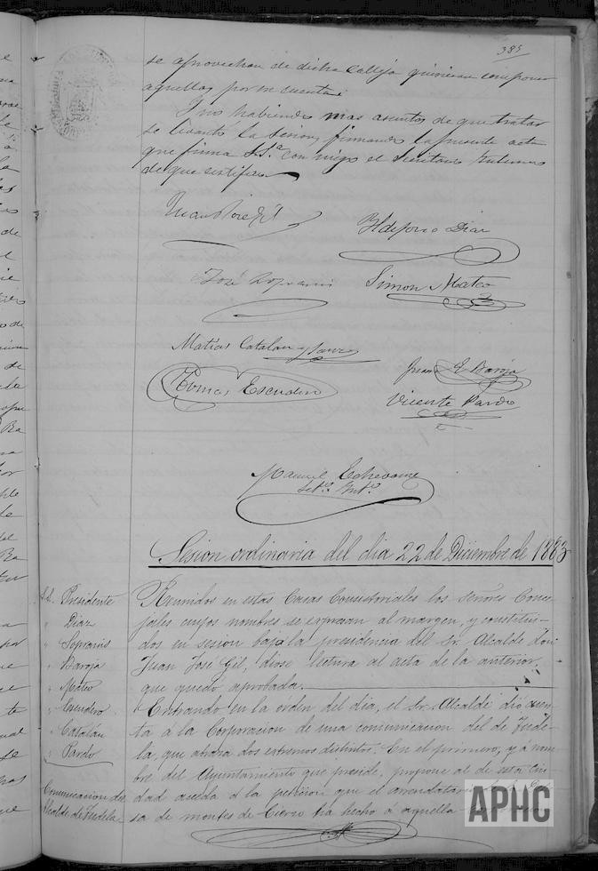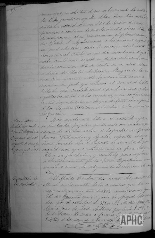 Escrito de Eusebio Migueloa y algunos vecinos de los pueblos de Grávalos, Cervera, Valdemadera y Aguilar, sobre el impuesto sobre la uva. Resultado de los arriendos para el año 1884: el de Garapito, a favor de Miguel Hernández, el de peso público para Justo Arellano, el de Docena de Aceite para José Buñuel, el de pescado para Fermín Caspe y el de venta matanza del tocino a favor de Eusebio Sánchez. Se acuerda llenar el pozo o nevera con el hielo de la laguna, para que tan pronto se presentara la ocasión oportuna se sacase a subasta pública el suministro de dicho producto.