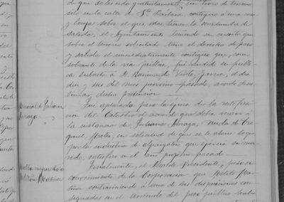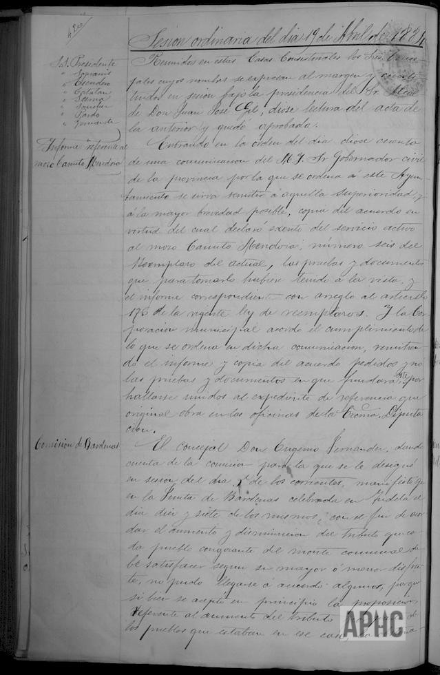 1884-04-19 – Solicitud de Juliana Arriaga, Viuda de Ezequiel Mateo, de que se le abone lo pagado por la industria de alpargatero que ejercía su marido; se aplaza a la época de rectificaciones catastrales. Se impone multa a Melitón Martínez, por utilización del peso público para venta de carbón a varios vecinos.
