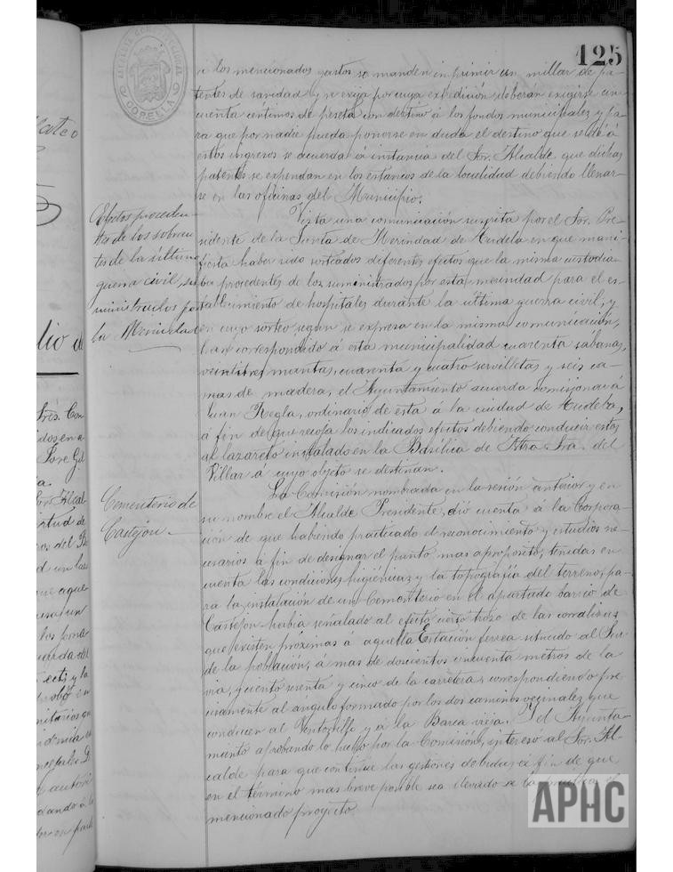 La comisión designada al efecto, informa de que el lugar para construcción de un cementerio en Castejón, considera debería ser un trozo de las corralizas próximas a la Estación férrea al Sur de la población, a más de 250 metros de la vía y 175 de las carreteras correspondiendo al ángulo formado por los dos caminos vecinales que cond8ucen al “Ventorrillo” y a la Barca Vieja. Se autoriza a Nicasio Ardóiz que pueda extraer piedra en la cantera del cabezo del Molinillo, sita encima del río de Martirroyo, por dos meses y a contar de la finalización del plazo concedido a Severo Delgado. Se abonan a Manuel Escudero gastos por trabajos de herrería y hojalatería.