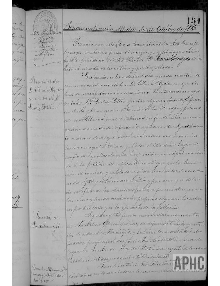 Tiburcio Ayala en nombre del propietario Andrés Arteta, solicita autorización para realizar unas obras de defensa por avenidas de agua del río Alhama, en sus propiedades del soto y finca en el término de Recueja. Compra de un sello para el Matadero Público, a fin de señalar las piezas sacrificadas en él y sancionar los fraudes cometidos por matanzas furtivas, especialmente las realizadas por Hipólito Ortega, denuncia formulada por el rematante de dichos impuestos Dionisio Gurucharri. Abono a Tiburcio Delgado, factura por trabajos de cantería.