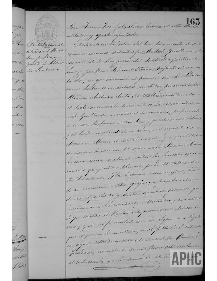 Modesto Guillorme, encargado de limpieza del Matadero y Pascual Oteiza Inspector de carnes, notifican varios hechos escandalosos cometidos por el cortador Atanasio Andueza con amenazas a varios vecinos, se acuerda prohibir la entrada en el Matadero a dicho cortador.