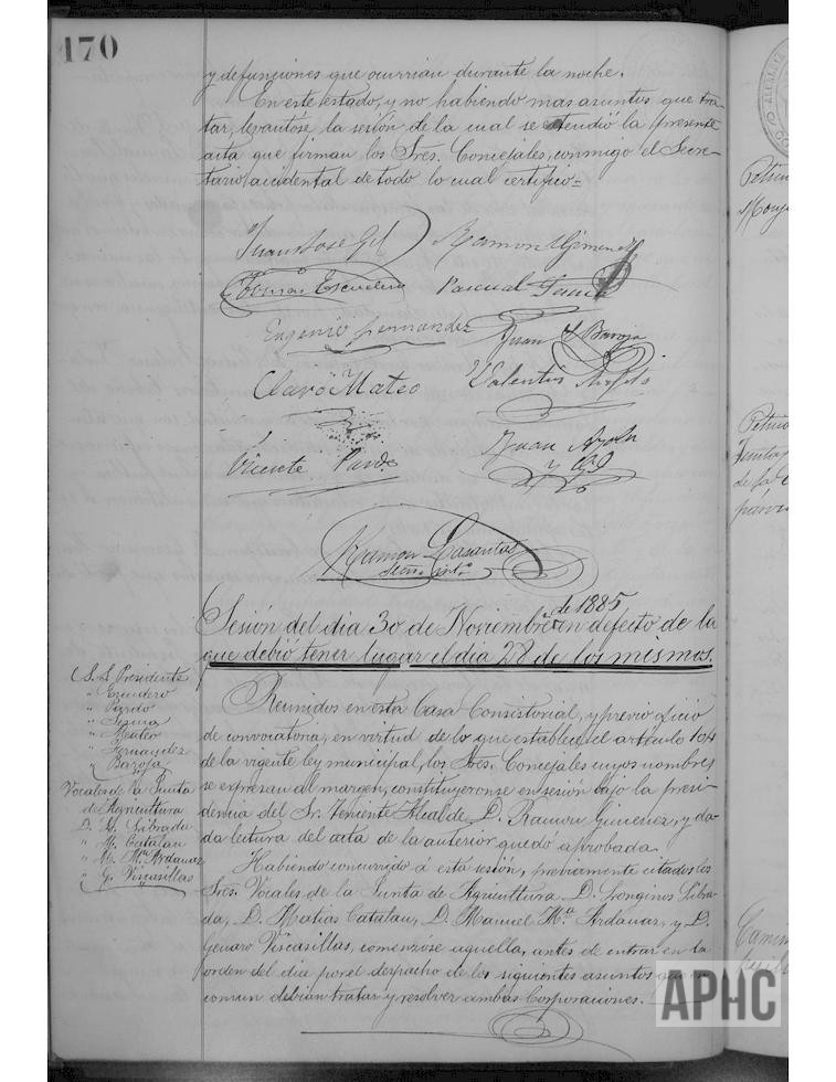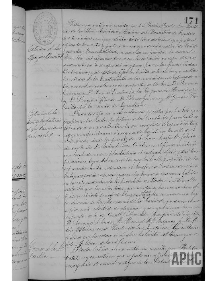 Sor Martina de la Santísima Trinidad, Abadesa del Monasterio de Benitas, solicita cierto terreno comunal anexo entre su huerta y el río Cañete. En la calle San José, junto al río Cañete, existe fábrica de aceite de Pascual Pérez Oñate (¿Puede ser la que en los años 1960s era de Pablo Ovejas?). Se compran trajes para Alguaciles y Conserje.