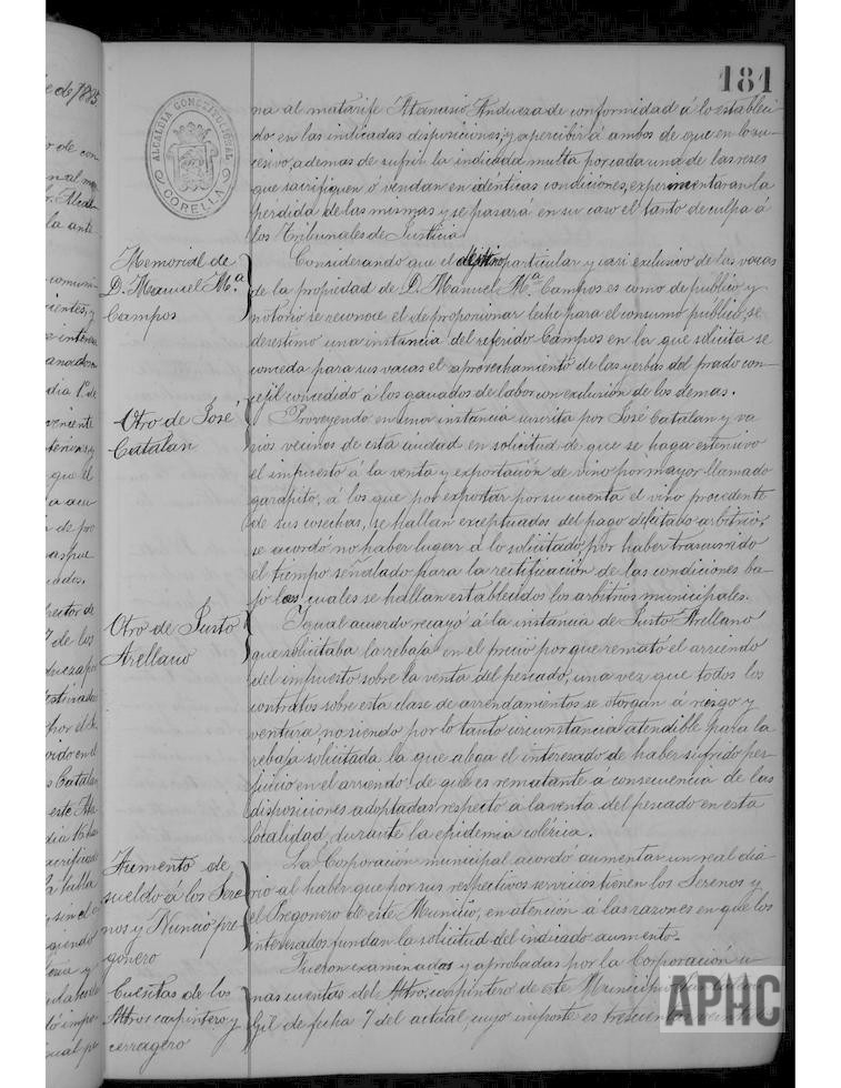 Se manifiesta que el aprovechamiento de hierba del prado municipal es para ganados de labor y no para vacas de leche. Justo Arellano, rematante del impuesto de pescado, solicita rebaja del mismo y no se concede. Es Maestro cerrajero Domingo Martínez. Celestino Catalán Sanz, carnicero, solicita se le admita a su cortador Atanasio Andueza. Presenta su dimisión voluntaria, por motivos de salud, el Médico Esteban Sánchez Santana, del distrito de San Miguel.