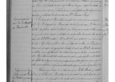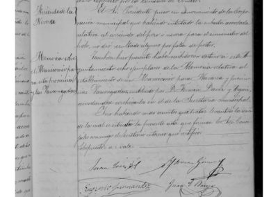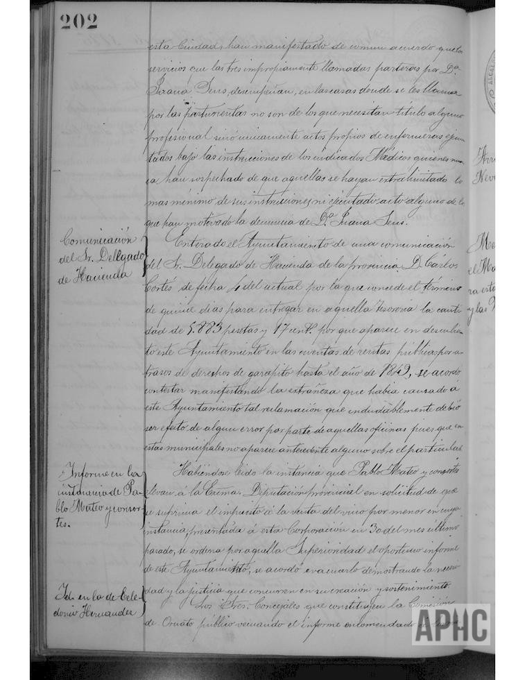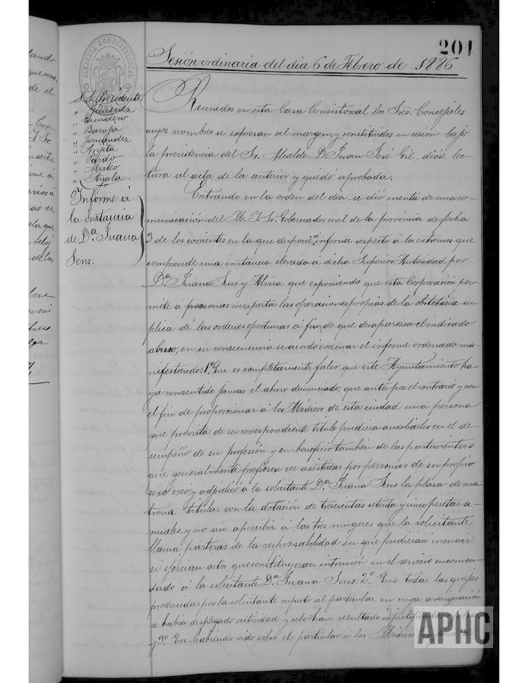 Vista instancia presentada, se acuerda el nombramiento de Matrona a Juana Sens. Su autoriza a Celedonio Hernández la realización de un conducto para unir dos casas en la calle de San Francisco. Se declara desierta la subasta para el arriendo del pozo de nieve o nevera, por no haber ningún postor. Se reciben 8 ejemplares de la Memoria relativa al establecimiento de un Manicomio, para Navarra y provincias Vascongadas, instituido por Fermín Daoiz Argaiz, acordándose se archiven en la Secretaría de este Ayuntamiento.