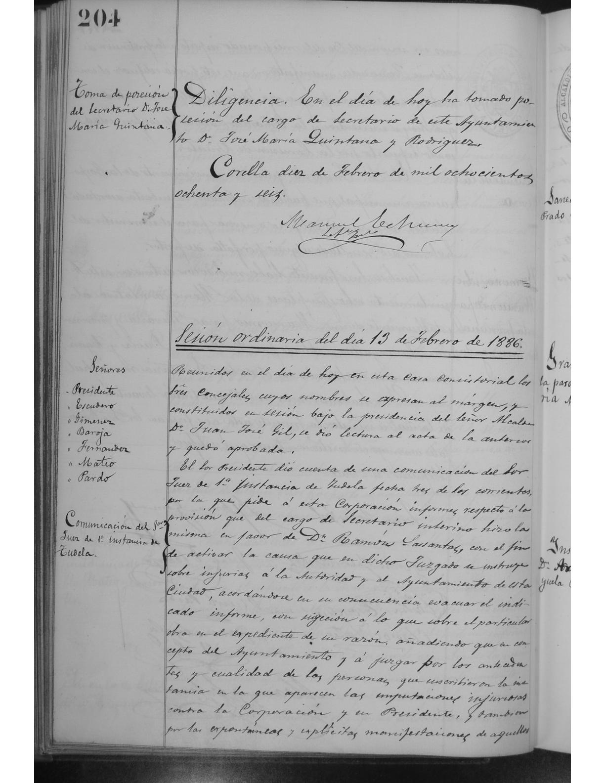 Existe una Diligencia de fecha 10-02-1886, para constatar la toma de posesión del Secretario Municipal del Ayuntamiento José María Quintana Rodríguez.