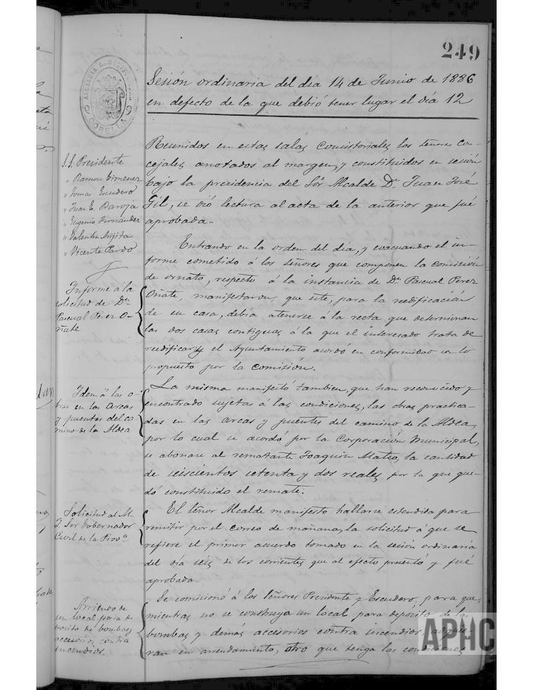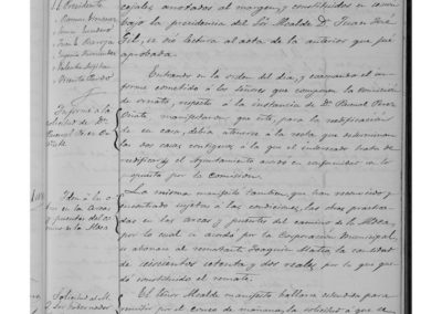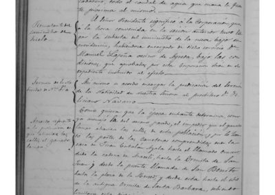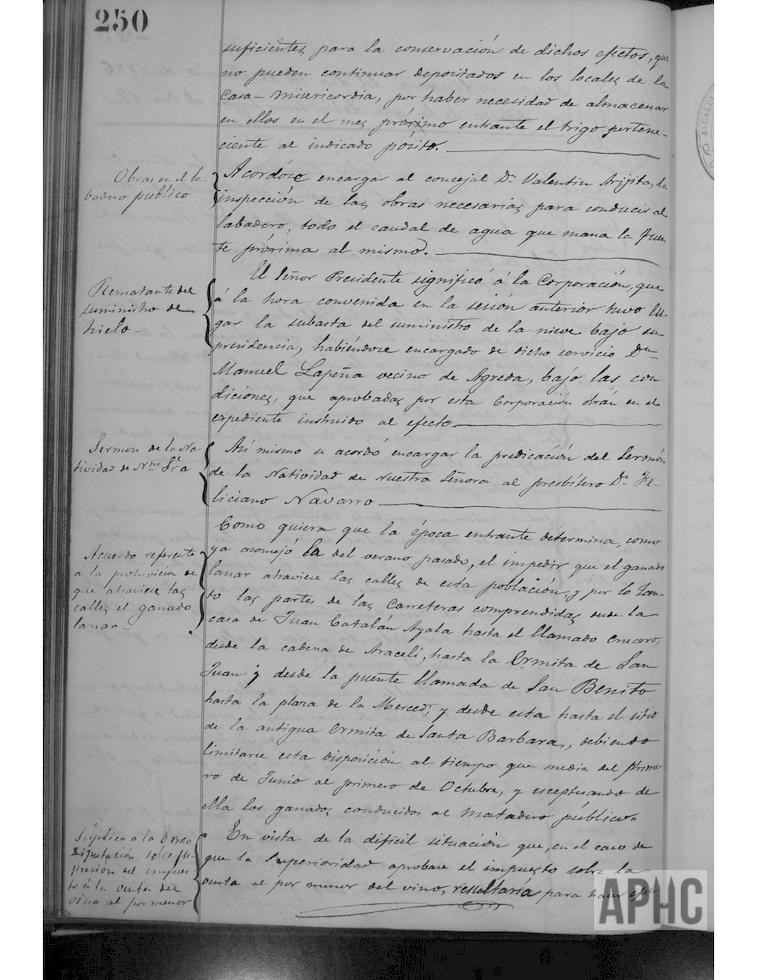 Se acuerda que, en tanto no se construya un local adecuado, donde puedan estar las bombas anti incendios, se busque uno en arriendo ya que es necesario sacarlas de la Casa de Misericordia, donde se encuentran depositadas. Se encarga al concejal Valentín Arigita, que informe de las obras que serían necesarias, para conducir al lavadero el agua que mana de la fuente próxima. Se adjudica el suministro de nieve a Manuel Lapeña, vecino de Ágreda. Al Presbítero Feliciano Navarro, se le encarga el sermón de la Natividad de Ntra. Señora. Se limitan las calles por donde puede atravesar la población el ganado lanar, en los meses de Junio a Octubre, utilizando las carreteras comprendidas desde la casa de Juan Catalán Ayala hasta al Crucero; desde la cadena de Araceli hasta la ermita de San Juan, y desde la puente de San Benito hasta la Plaza de la Merced, y desde esta, hasta el sitio donde estaba la ermita de Santa Bárbara