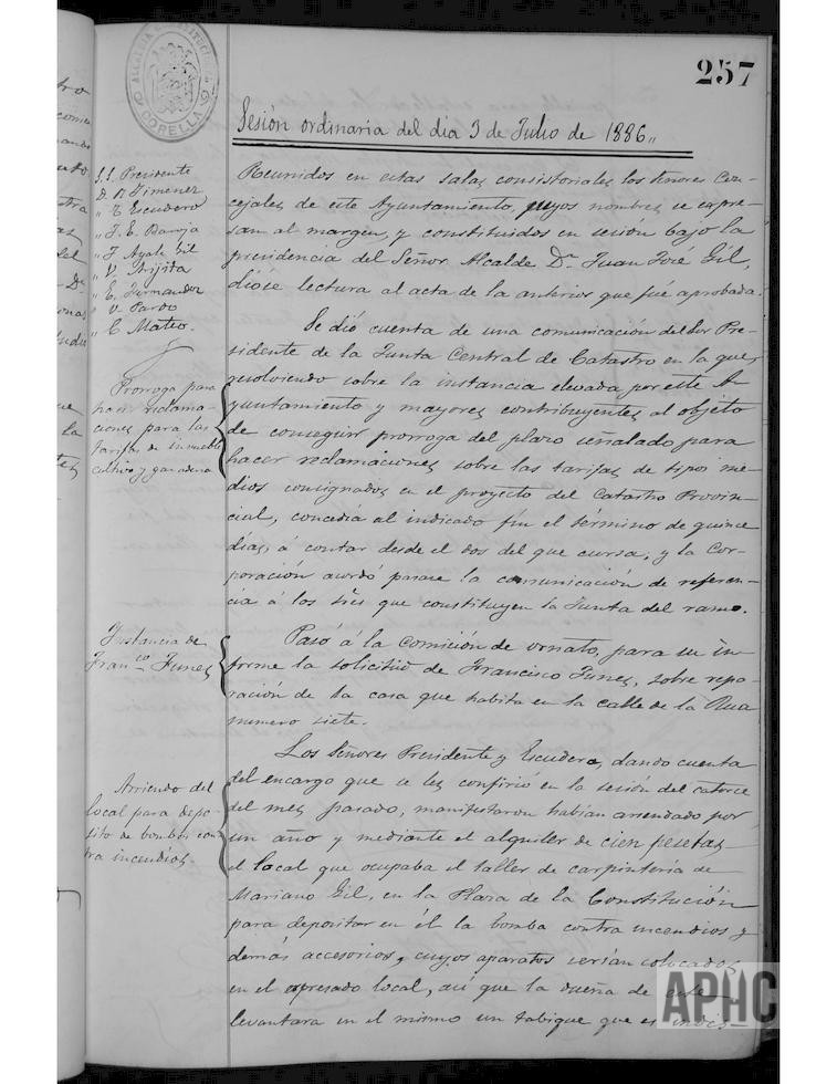 Se arrienda local para el depósito de las bombas contra incendios, en la Plaza de la Constitución, en local que ocupaba la carpintería de Mariano Gil. El concejal Valentín Arigita, informa que ya están finalizadas las obras de conducción de las aguas de la fuente del “Buen Deseo”, al lavadero público.